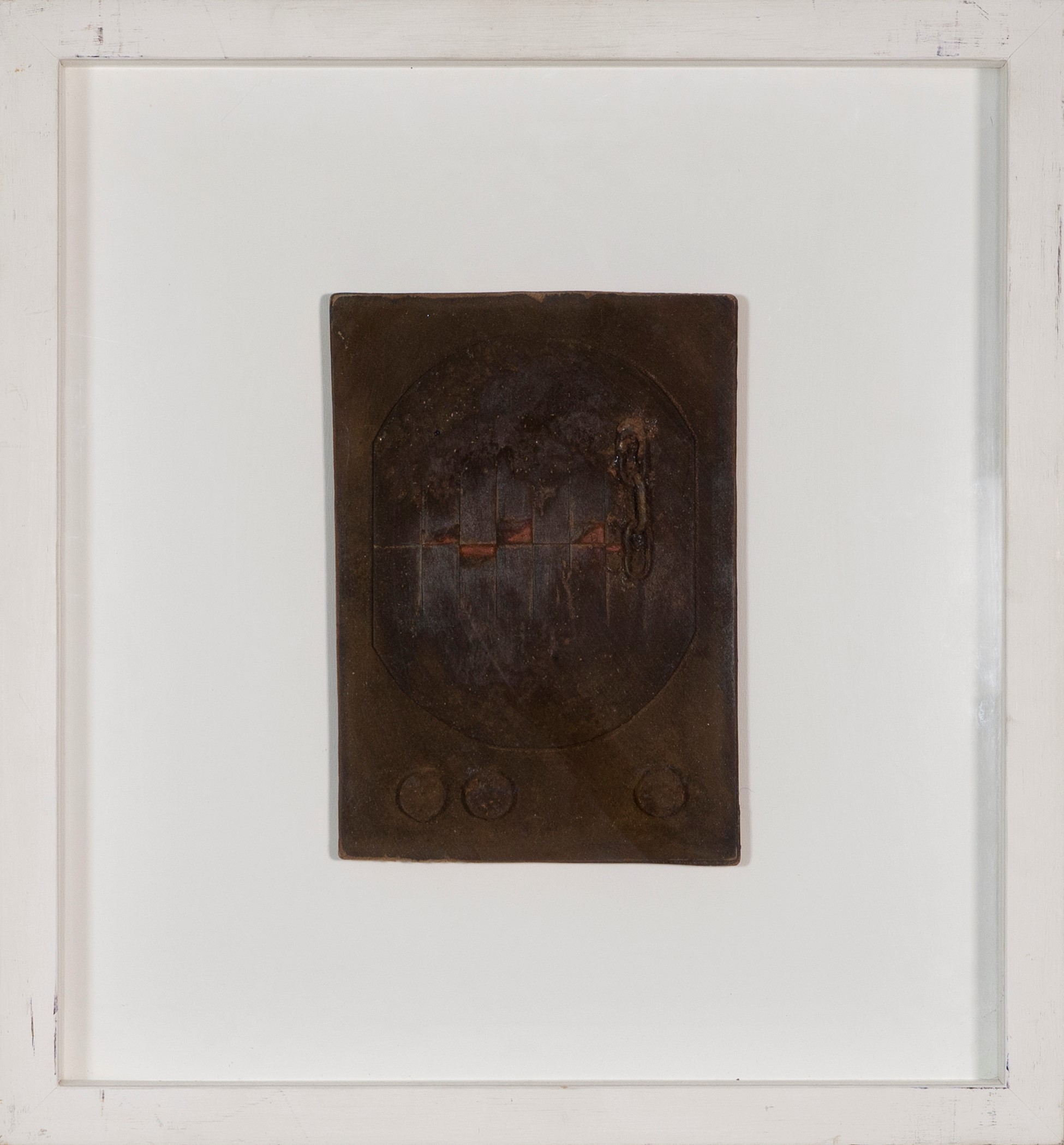legno, ferro, terre refrattarie su tavola, cm. 23x16x1