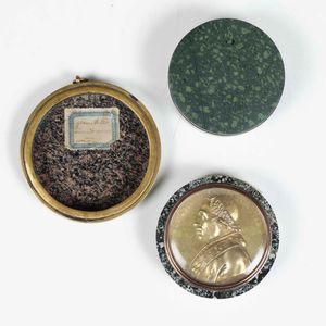 Lotto di due tabacchiere in marmi e una cornice in marmo e metallo dorato, Roma, [..]