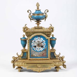 Orologio in bronzo dorato, placche in porcellana in stile Sèvres. Francia, XIX s [..]