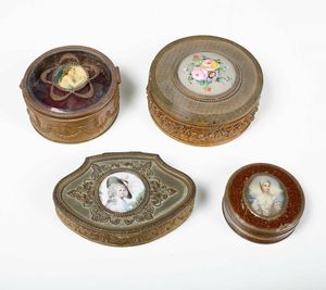 Lotto di quattro scatole diverse in lamierino dorato e bronzo. XIX-XX secolo