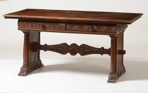 Tavolo lastronato e filettato, intarsiato a motivi geometrici. XVIII-XIX secolo