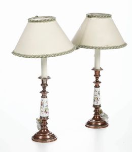 Coppia di candelieri in rame e porcellana policroma. Secolo XIX