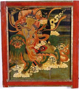Pannello in legno dipinto raffigurante Guanyin assisa su drago. India-Tibet, XIX [..]