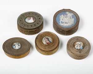 Lotto di cinque scatole diverse in lamierino dorato e bronzo. XIX-XX secolo