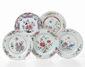 Lotto di cinque piatti diversi tra loro, Cina Compagnia delle Indie, XVIII secol [..]