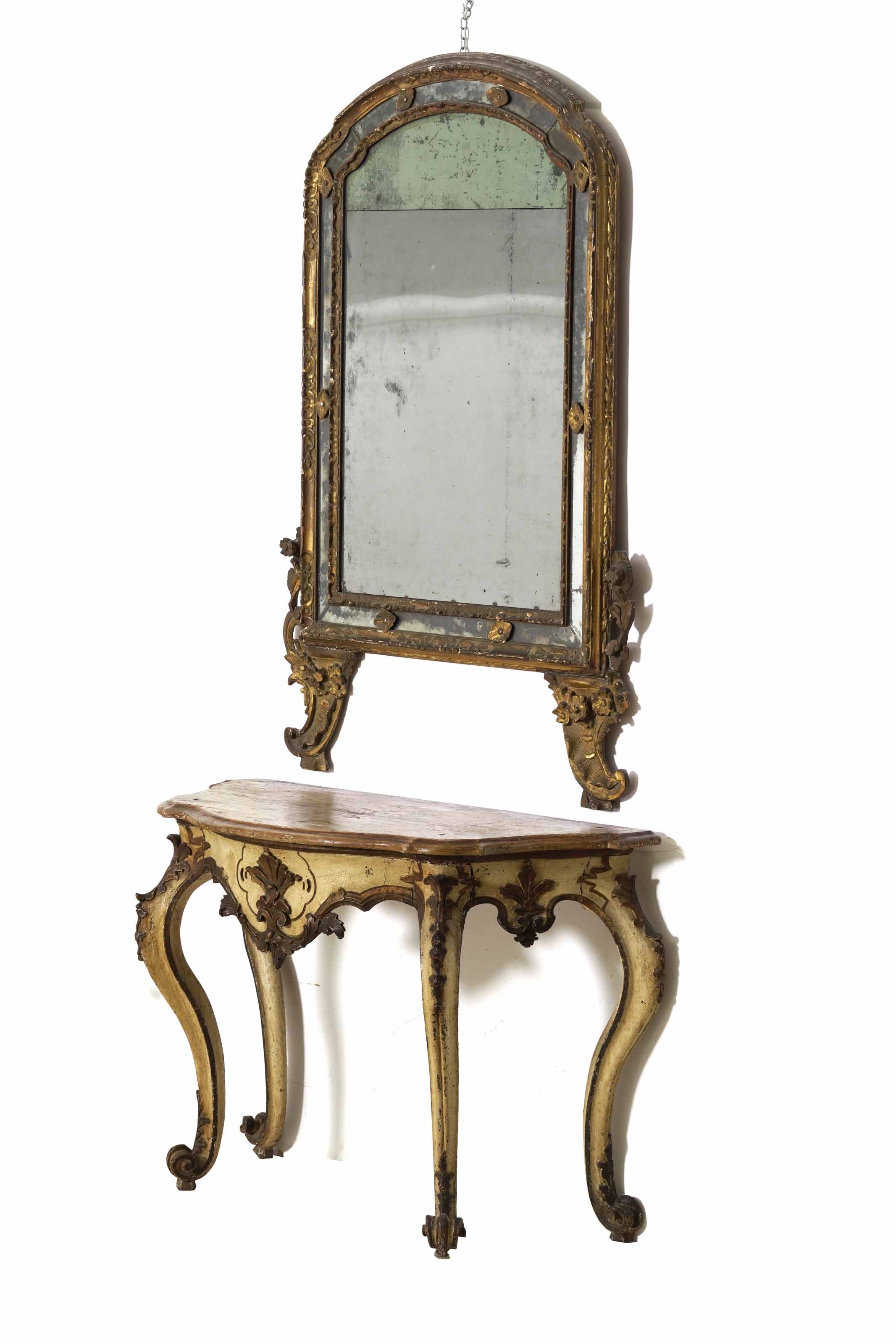 Consolle con specchiera in legno intagliato e laccato. XIX secolo