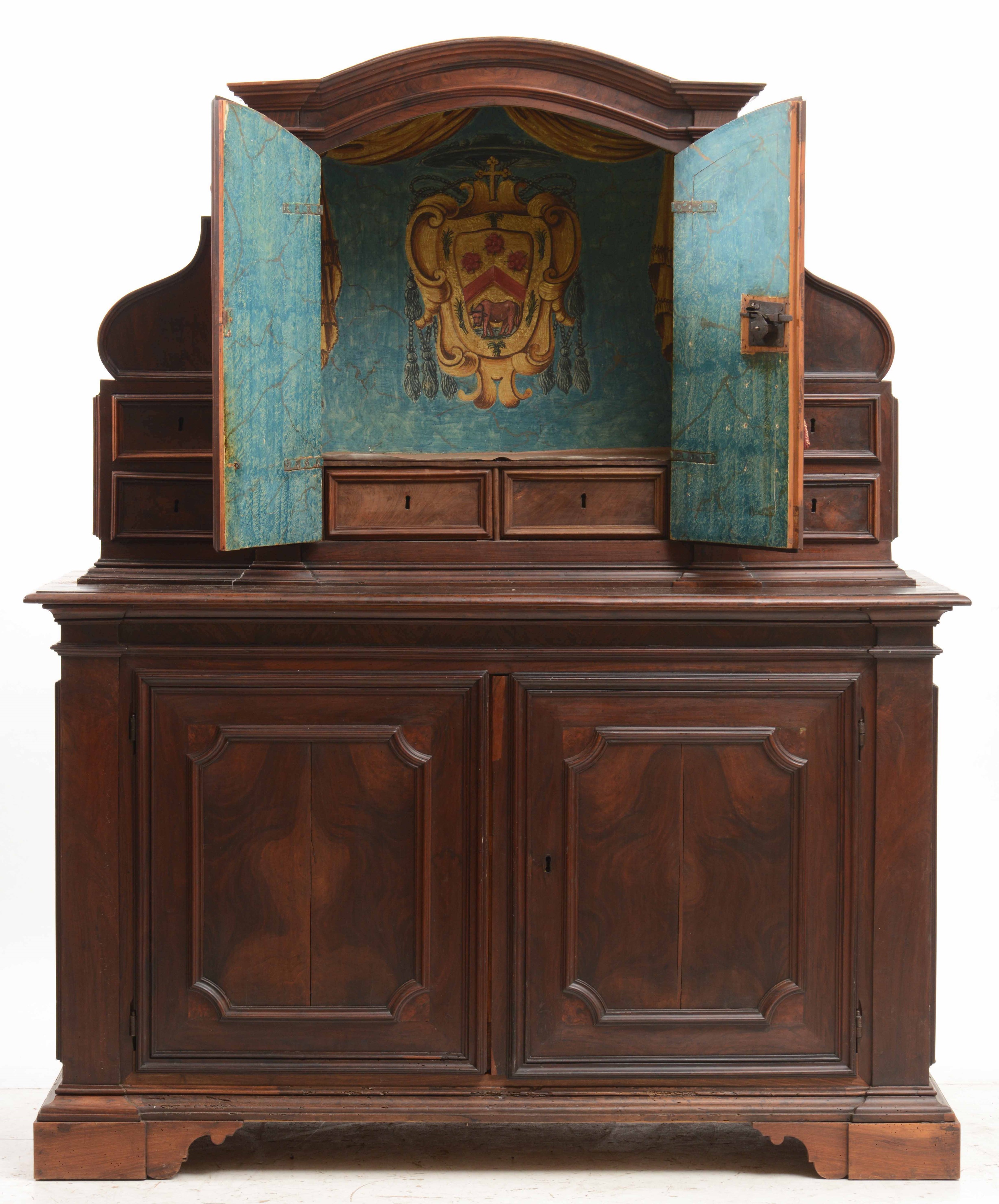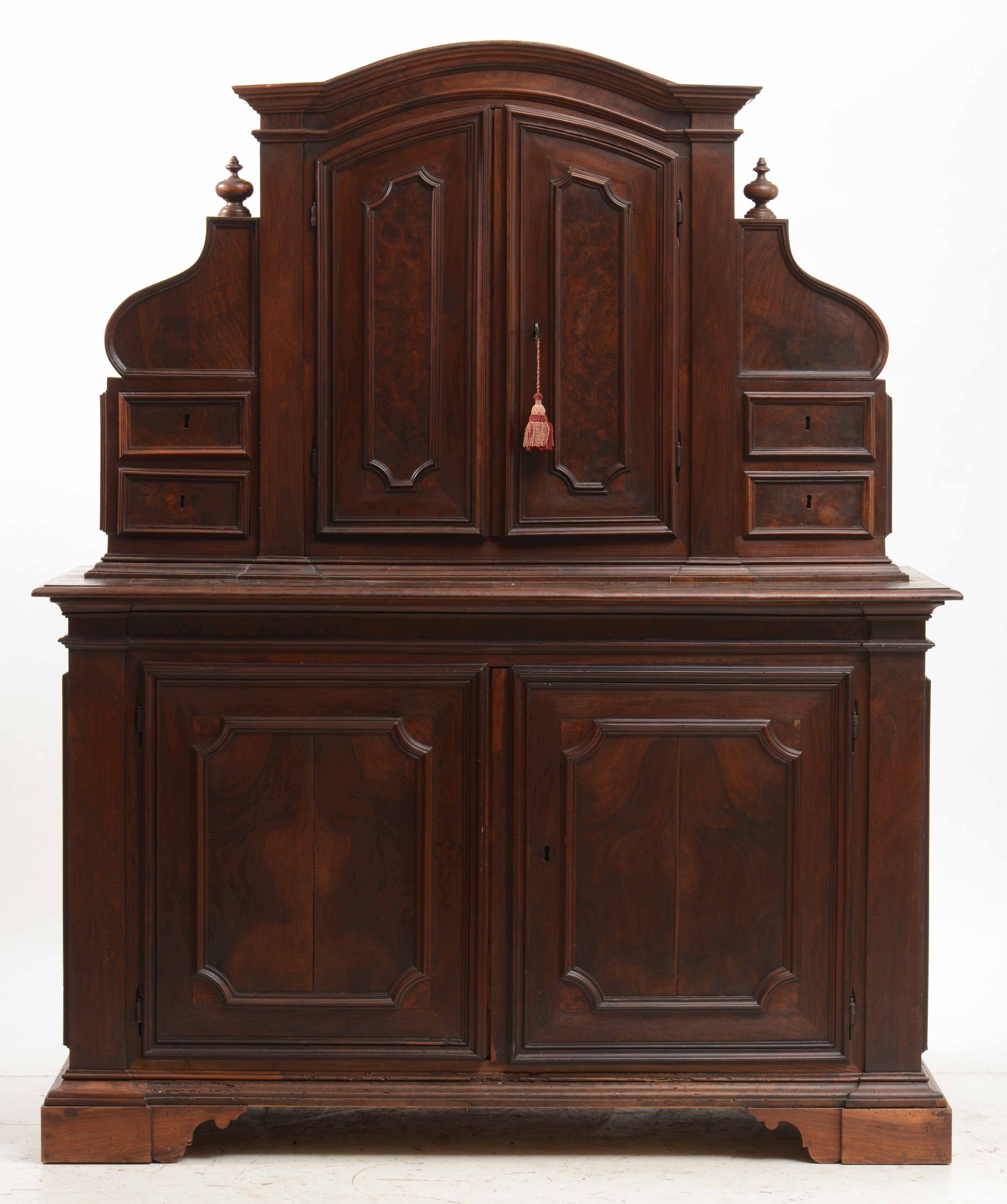 Grande credenza in noce a due corpi. Italia centrale, XVIII-XIX secolo