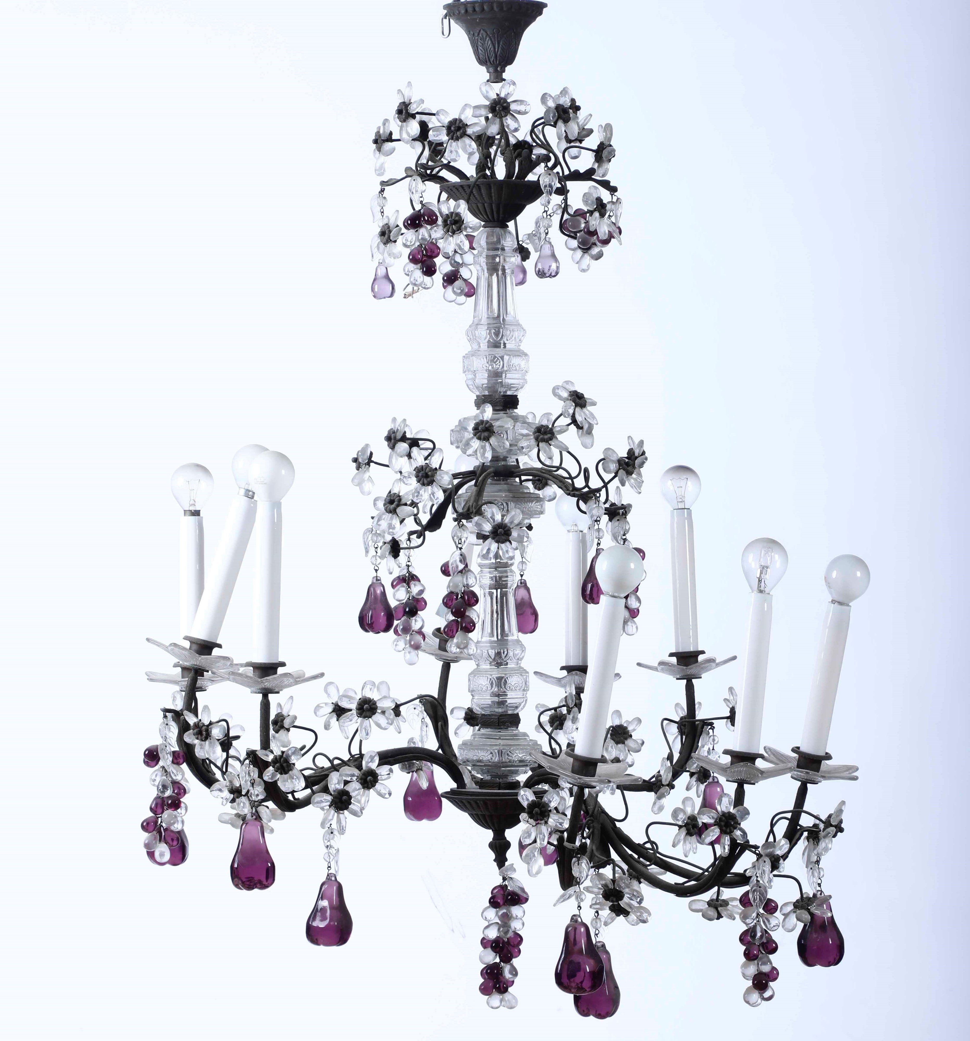 Lampadario a otto luci con pendenti in vetro e ametista, XIX-XX secolo