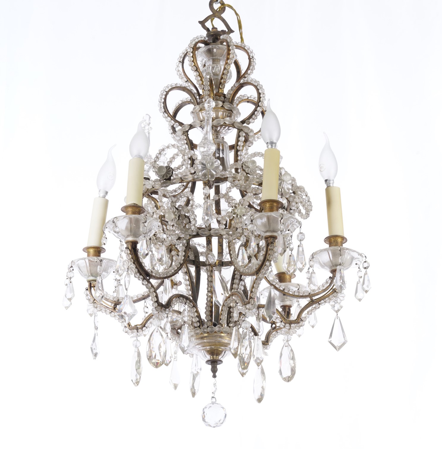 Lampadario in metallo dorato, perline e pendenti in vetro molato, XIX-XX secolo
