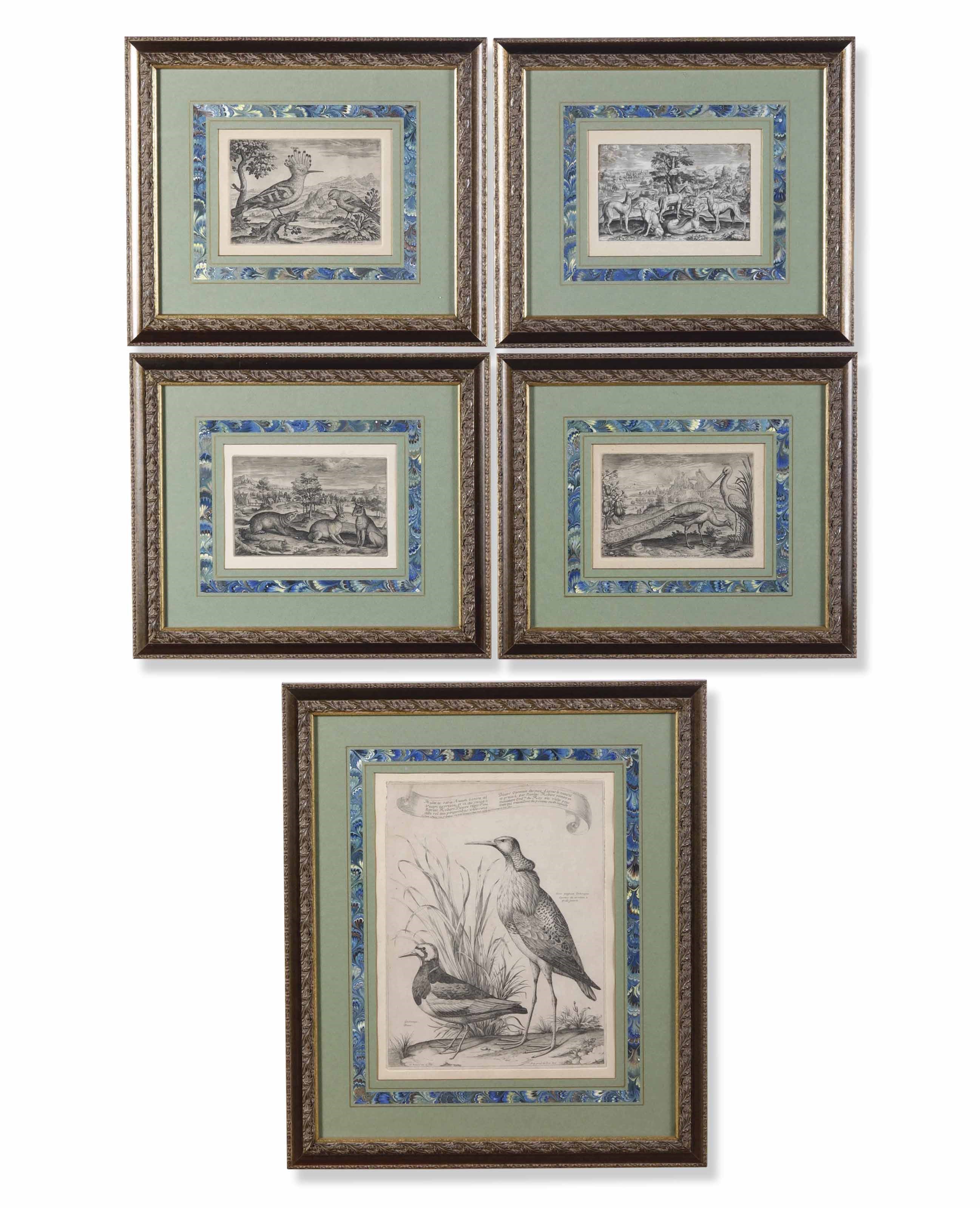 Lotto di cinque incisioni con volatili e animali. Secoli XVII e XVIII