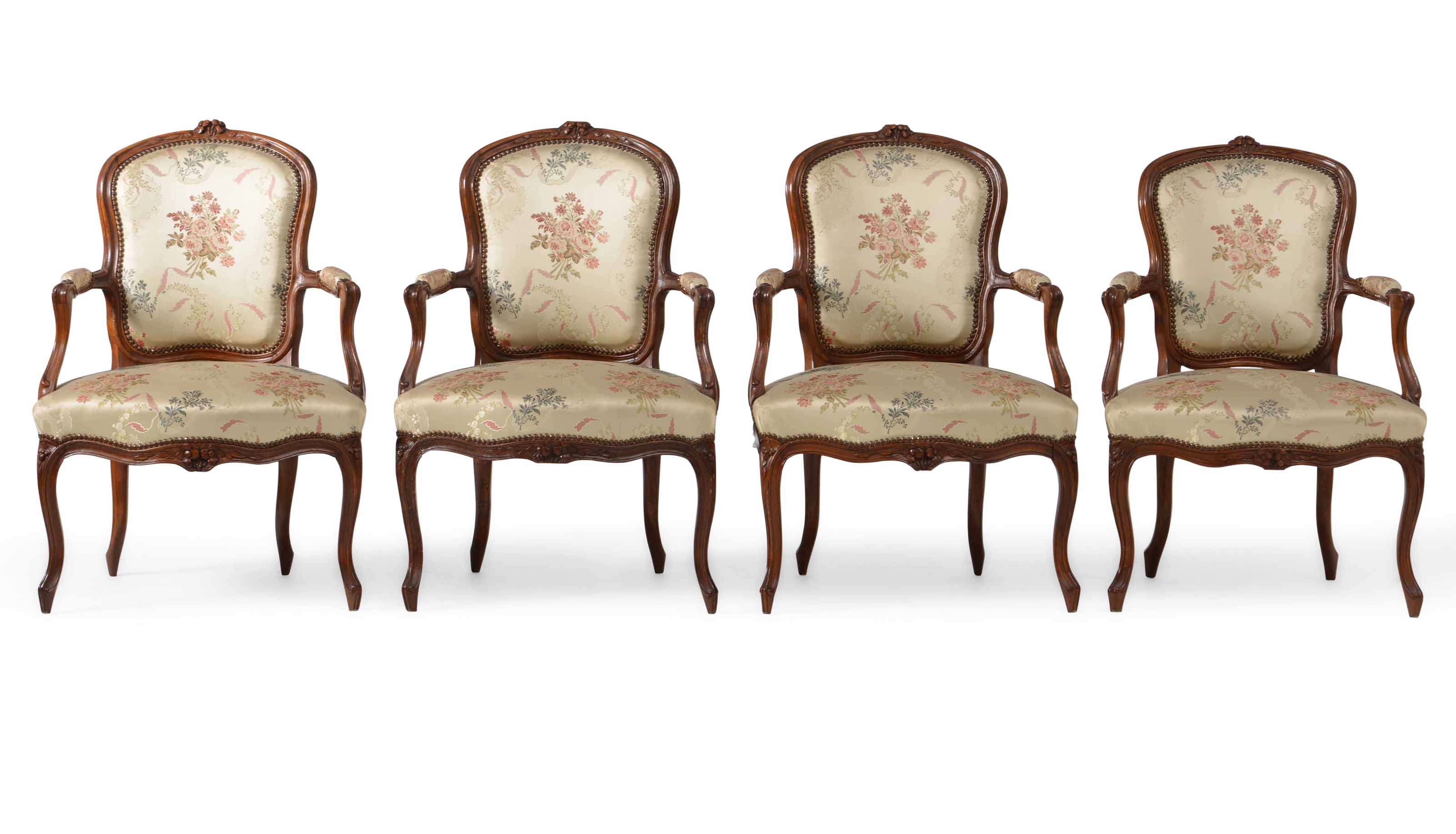 Quattro poltroncine in noce intagliato, Francia XVIII secolo
