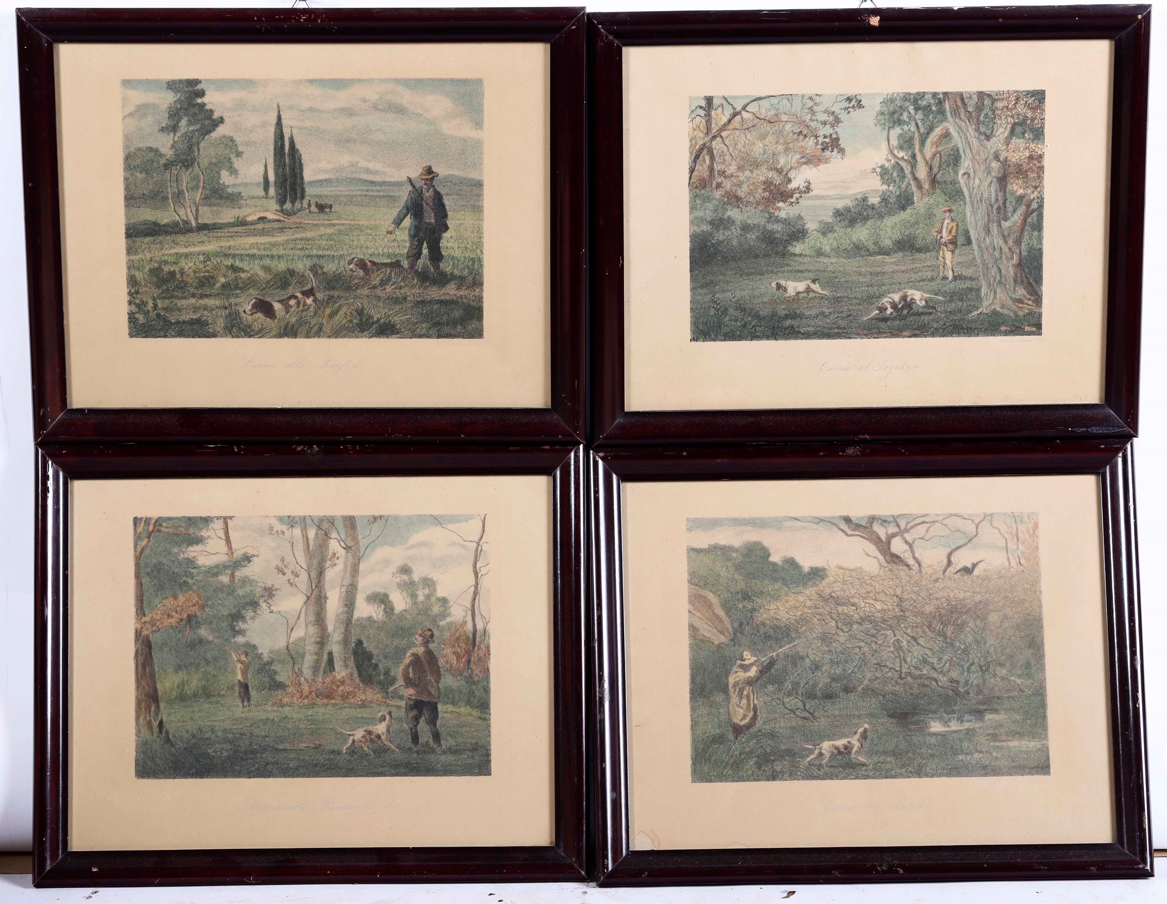 Serie di quattro incisioni colorate a soggetti venatori. XIX secolo