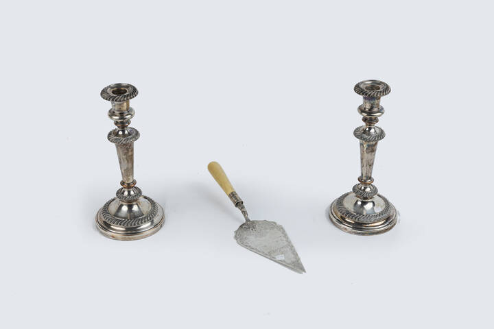 Composto da: - 1 coppia di candelieri a una sola luce con basi in resina. Peso lordo gr 2124 4 - 1 cazzuola. Peso lordo gr 224 6