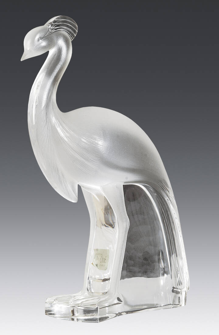 H. cm 35 5 Etichetta Cristal Lalique Paris sotto la base Pavoncella in cristallo bianco e satinato. Autentica e scheda a cura di Franco Borga.