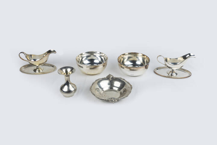 Peso complessivo gr 1822 9 Composto da: - 1 ciotola in argento con bordo sagomato (ammaccature). Peso gr 172 6 - 2 salsiere con piattino. Peso gr 392 2 e 390 0 - 2 ciotole ciotole lisce. Peso gr 699 9 - 1 piccolo vaso con corpo bombato. Peso gr 168 2