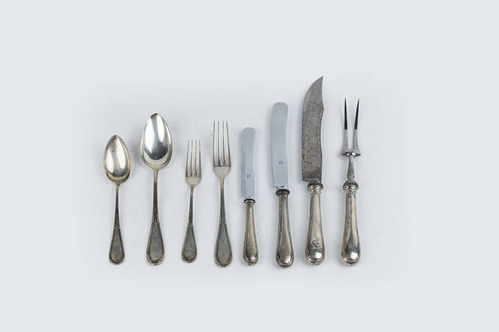 Peso gr 1726 2 Composto da: - 6 forchette grandi. - 6 coltelli grandi - 6 cucchiai [..]