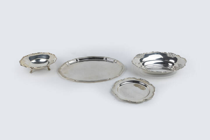 Peso gr 1933 6 Composto da: - 1 vassoio ovale con bordo mosso. Peso gr 1001 2 - 1 piatto rotondo Peso gr 282 7 - 1 alzata rotonda con bordo mosso poggiante su quattro piedini. Peso gr 241 8 - 1 centrotavola di forma ovale con bordo lavorato. Peso gr 407 7