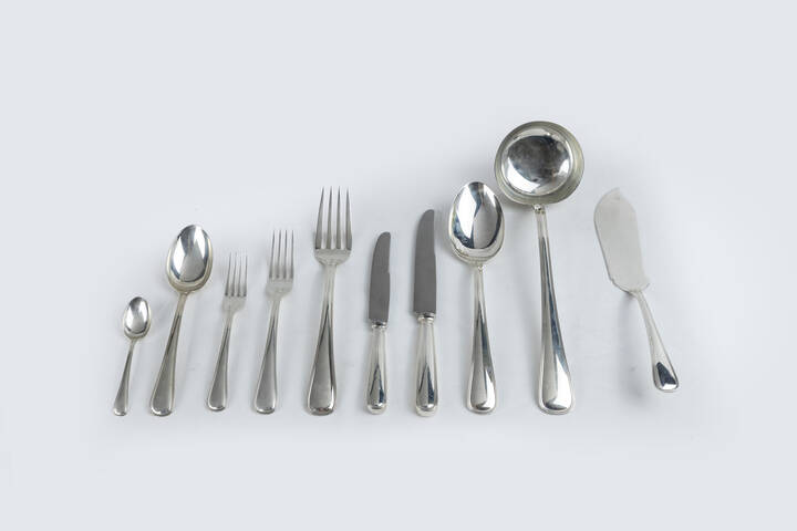 peso gr 237.3 peso gr 365.4 peso gr 511.6 peso gr 811.0 peso gr 231.2 peso gr 327.9 peso gr 472.9 peso gr 807.4 Servizio in argento 925/1000 firmato Gian Mario Buccellati composto da: - 1 mestolo - 3 posate - 12 forchette piccole - 12 cucchiai grandi - 12 cucchiaini - 12 coltelli piccoli - 12 coltelli grandi - 12 forchette grandi