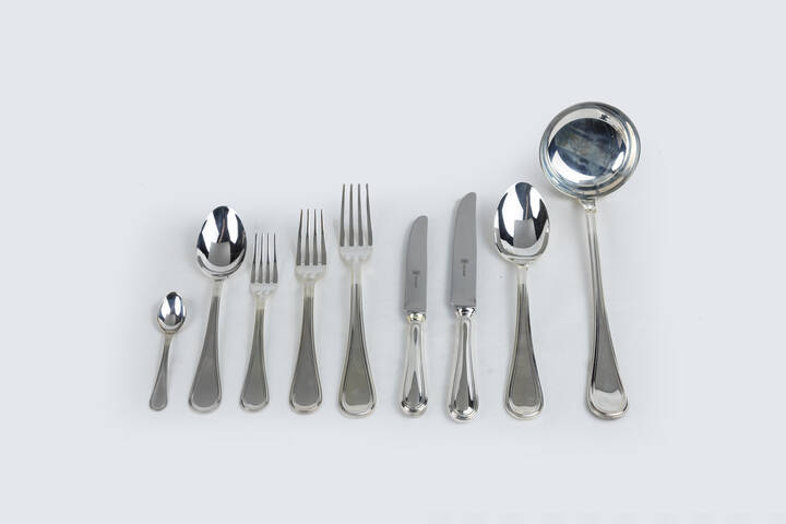 Peso gr 3398 0 Composto da: - 12 cucchiaini - 1 mestolo - 12 forchette grandi - 1 forchetta grande - 12 forchette medie - 12 coltelli medi - 12 cucchiai grandi - 1 cucchiaio grande - 12 coltelli grandi