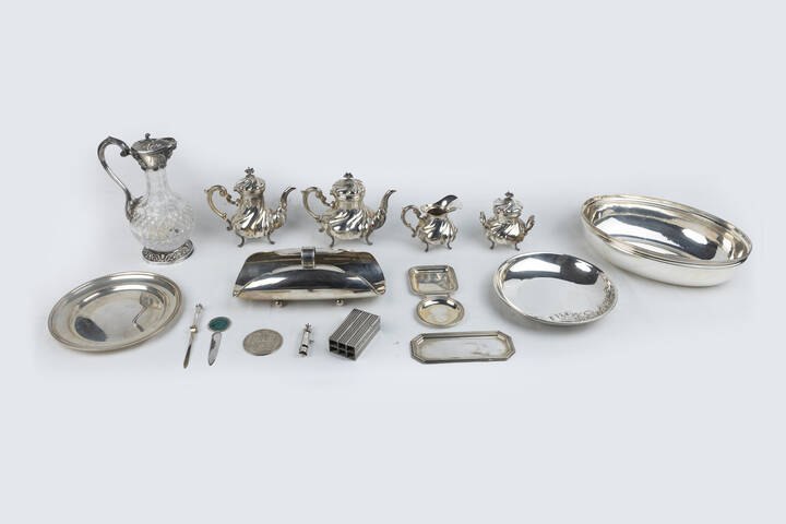 Peso gr 4312 2 Composto da: - 1 svuotatasche firmato M. Buccellati. in argento 925/1000. Peso gr 187 6 - 1 servizio composto da: caffettiera teiera lattiera e zuccheriera con corpi bombati lavorati a torchon. Prese a forma di fiore. Poggianti su quattro piedini. Peso gr 1191 5 - 1 portagrissini. Peso gr 539 8 - 1 portapenne. Peso gr 544 0 - 1 tagliacarte in argento 925/1000. Peso gr 40 2 - 1 piatto. Peso gr 290 4 - 1 fischietto in argento 925/1000 firmato Fasano Peso gr 37 7 - 1 tagliacarte in argento 925/1000 a forma di spada firmato Percossi Papi. con gemma azzurra sull'impugnatura. Peso gr 25 9 - 1 medaglia commemorativa Alma Mater Studiorum Secularia Nona. Peso gr 139 1 - 1 piattino rettangolare. Peso gr 77 6 - 1 piatto tondo in argento 925/1000 con sbalzo a motivi di frutta. Peso gr 266 5 - 1 centrotavola di forma ovale. Peso gr 877 9 - 1 versatoio con corpo in vetro; base e versatoio in argento 925/1000 con punzoni inglesi.
