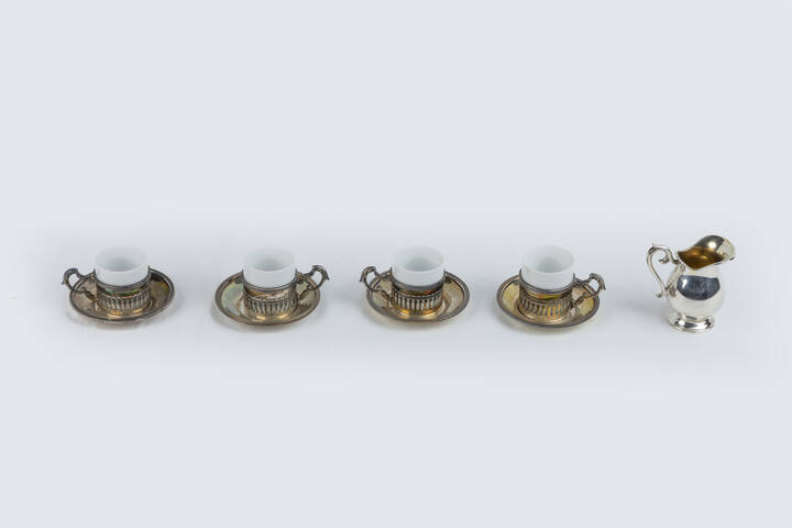 Peso gr 574 7 Composto da un set di quattro tazzine con struttura e piattini in argento e interno in ceramica e da una piccola lattiera