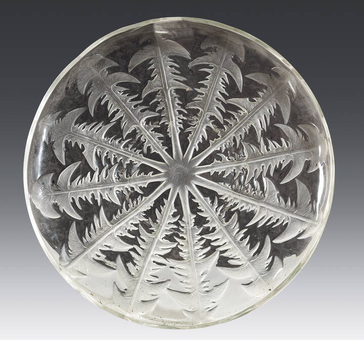 Diam. cm 29 5 Opera siglata VA France Piatto in vetro bianco e decoro opalescente di cicoria soffiato in forma. Autentica e scheda a cura di Franco Borga.