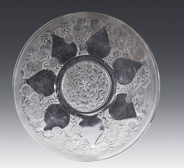 Diam. cm 27 Piatto in vetro bianco con incisioni stilizzate soffiato in forma. Autentica e scheda a cura di Franco Borga.