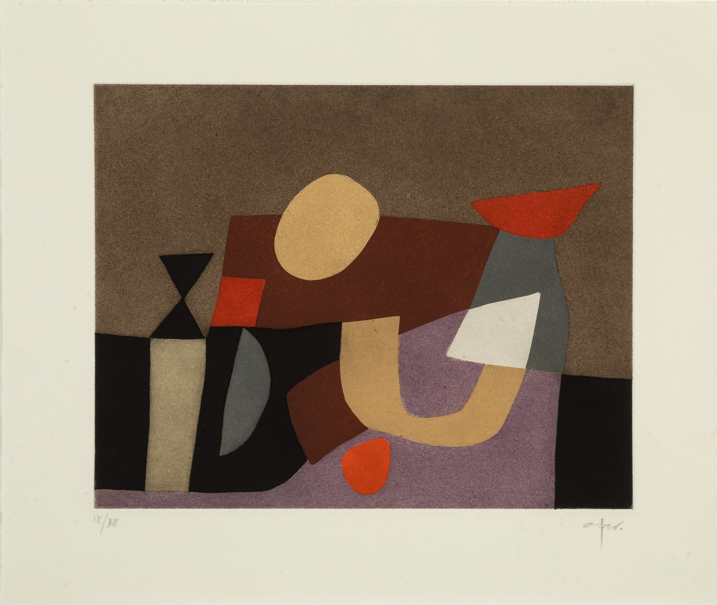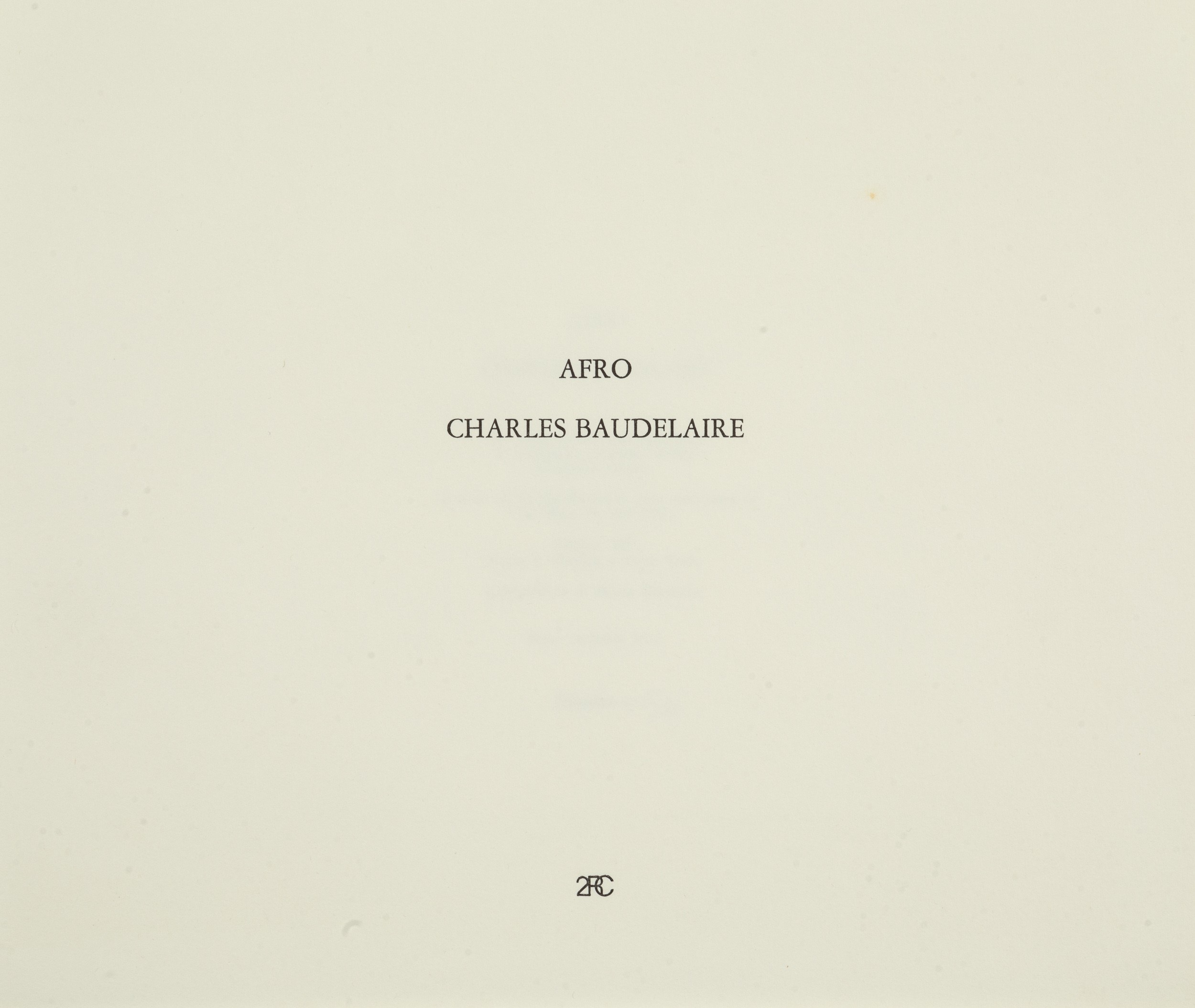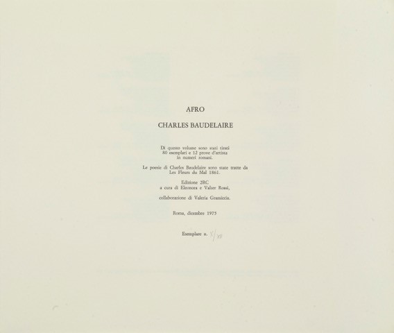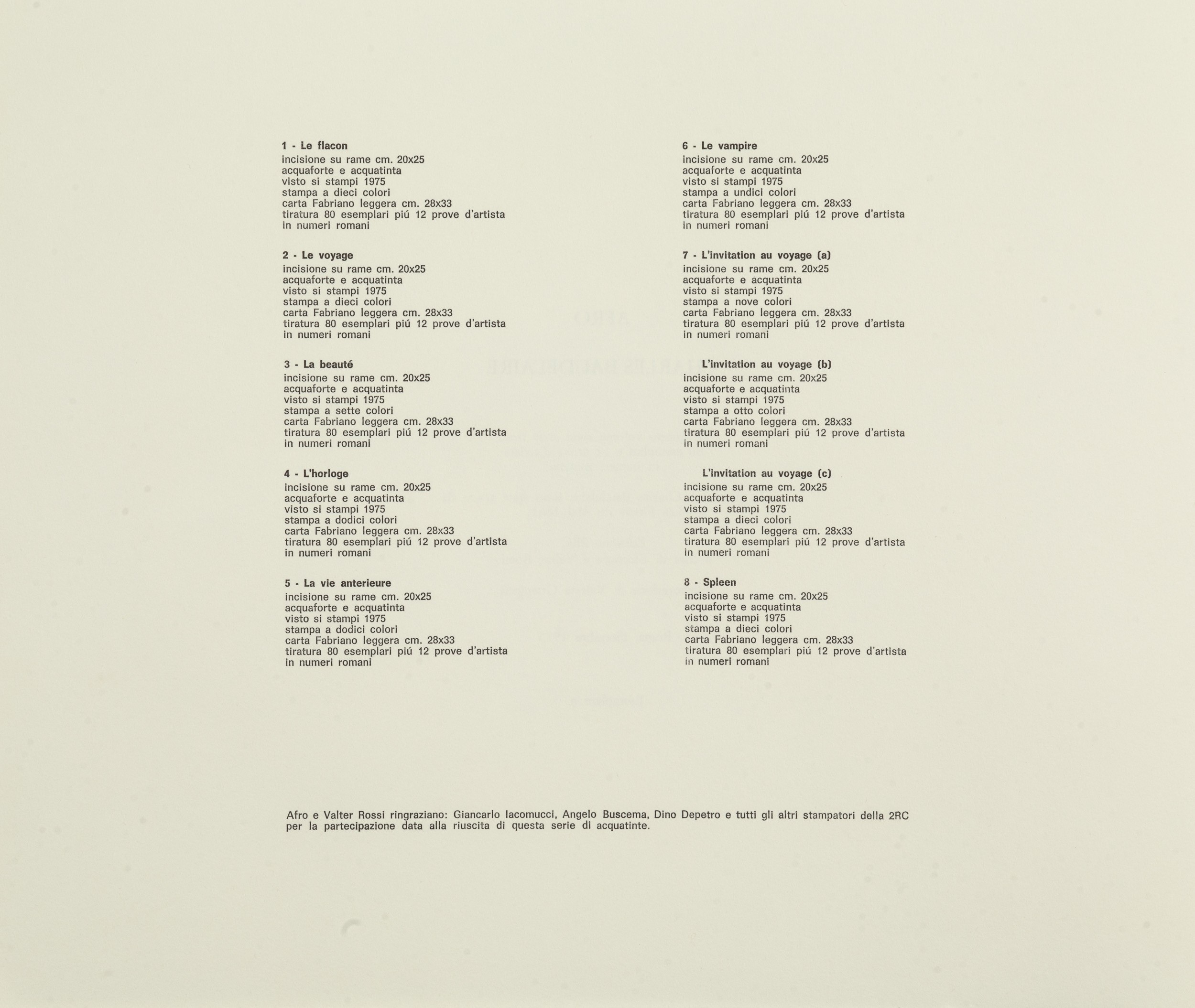 Cartella contenente 10 incisioni, Largh. 33 - Alt. 28 Cm 1975 es. X/XII su una tiratura di 80 esemplari e 12 prove d'artista in numeri romani Le poesie di Charles Baudelaire sono tratte da Les Fleurs du Mal del 1861 Edizioni 2RC, Roma Ciascuna incisione è numerata IX/XII in basso a sinistra e firmata in basso a destra
