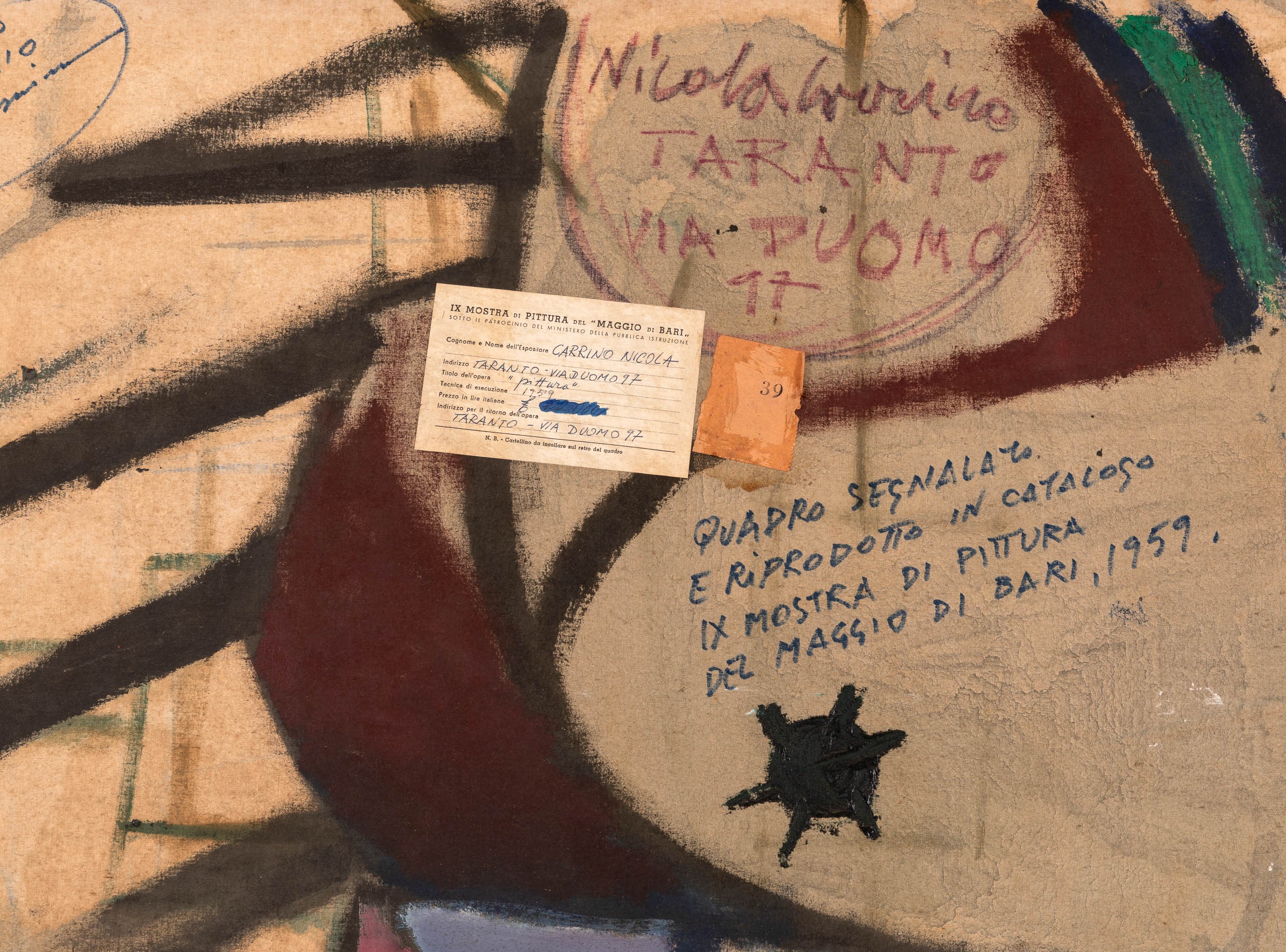 Etichetta al retro della IX mostra di pittura del Maggio di Bari
