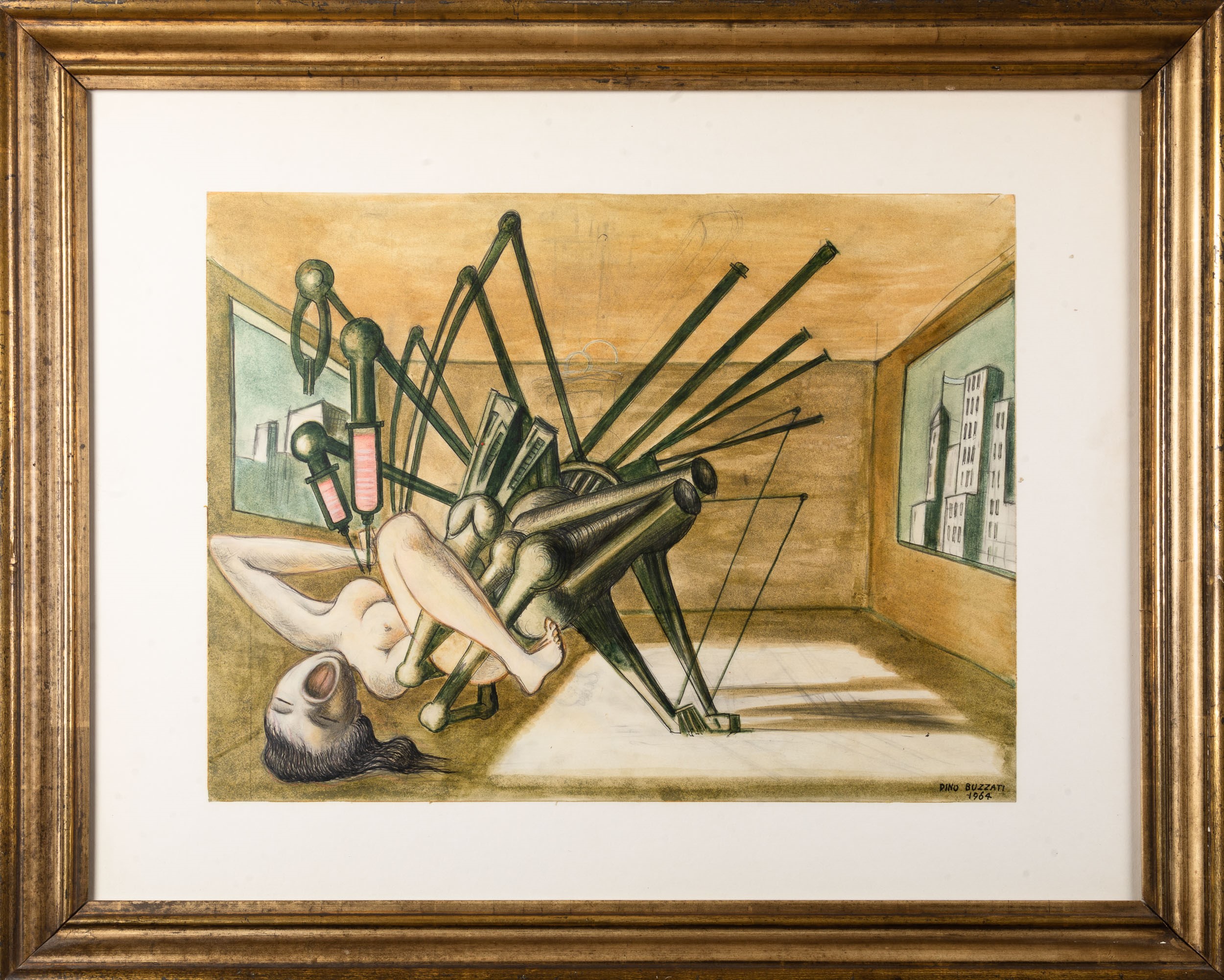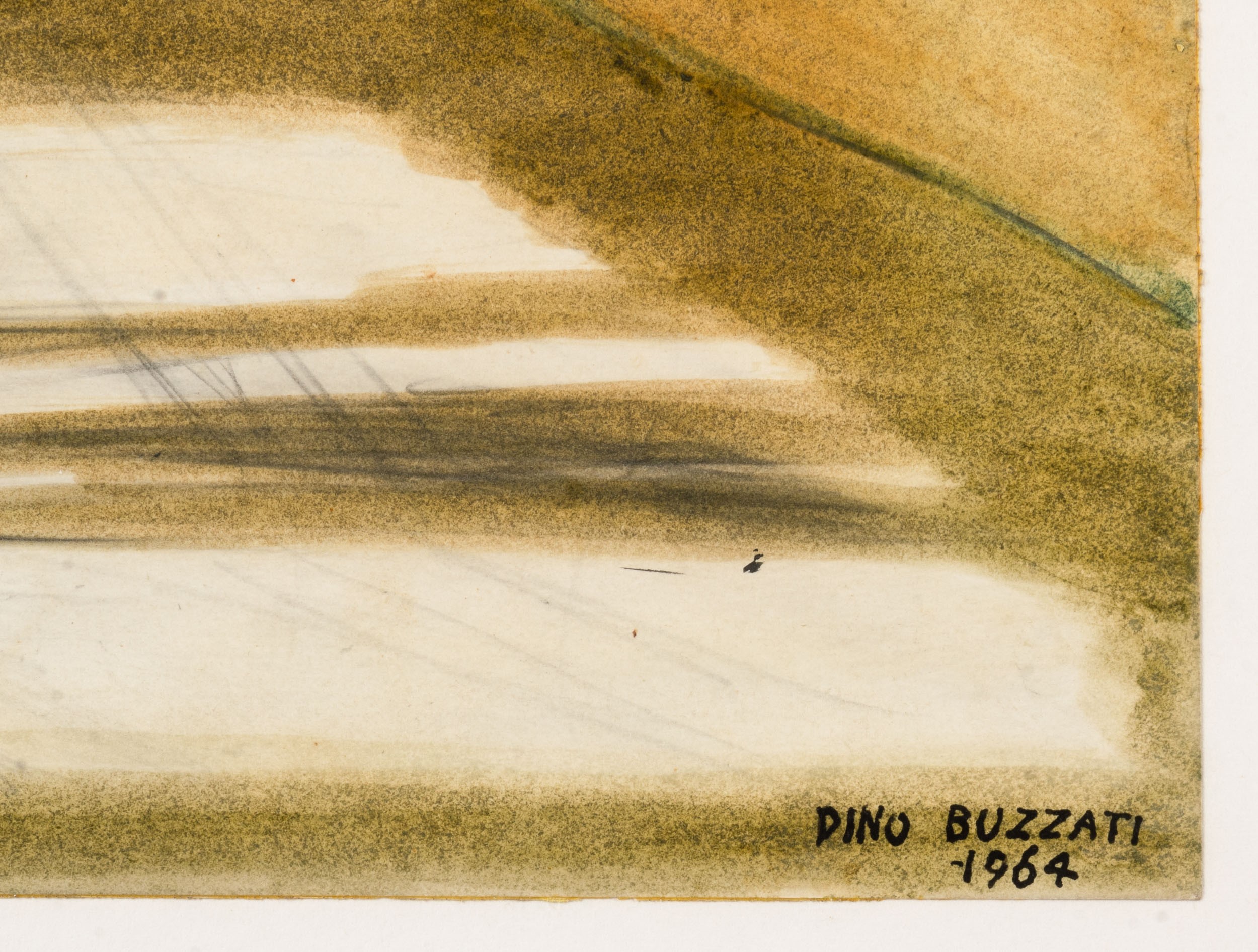 matita nera e pastelli, china e acquerelli su cartoncino bianco, Largh. 47,4 - Alt. 35,7 Cm 1964 firmato e datato in basso a destra dedicato al retro Etichetta al retro della Galleria Torbandena, Trieste Etichetta al retro della Galleria d'Arte Cavour, Milano Etichetta al retro della Galleria Consigli Arte, Parma