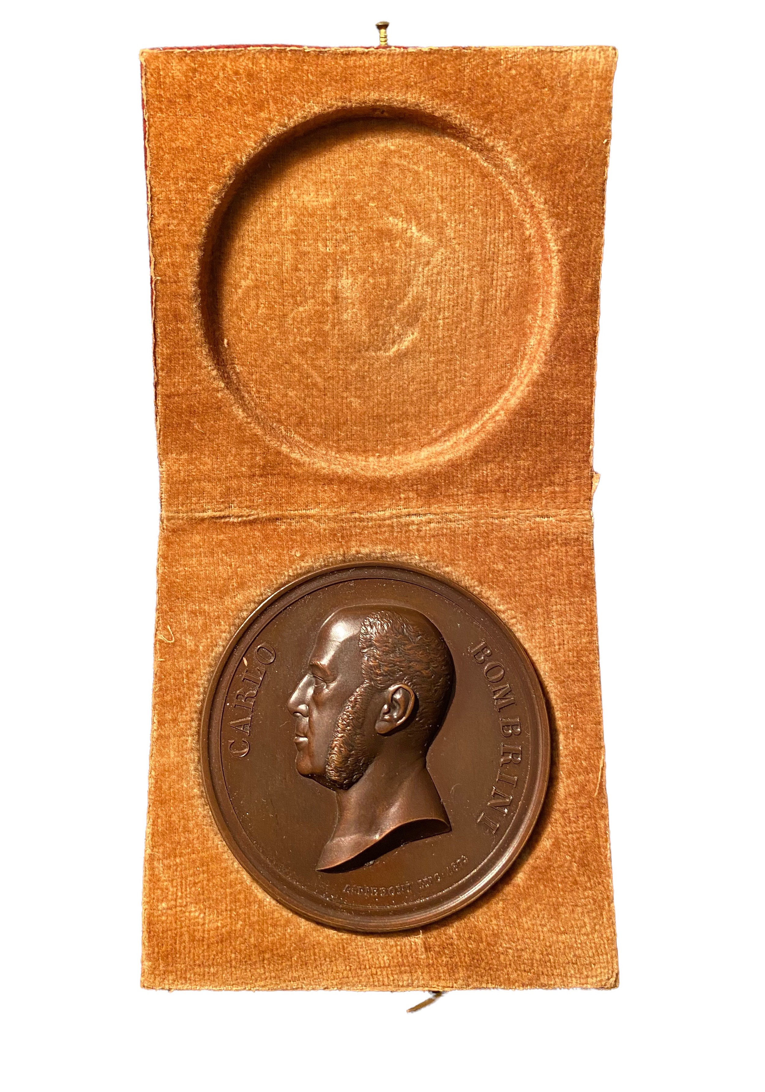 1882 D/ busto a sinistra, R/ nel campo, entro rami d'alloro e quercia legati da nastro, in basso: *AL FONDATORE DELLA BANCA NAZIONALE ITALIANA IL CONSIGLIO SUPERIORE A MDCCCLXXXII *, medaglista: Pieroni Adolfo, Metallo: AE, gr. 57,12, Diam.: mm. 49,29. La medaglia coniata, realizzata nel 1882, a ricordo di Carlo Bombrini (1804-1882) banchiere, fondatore della Cassa di Genova e della Banca Nazionale; fu senatore del Regno, eletto nel 1871. SPL. Con cofanetto