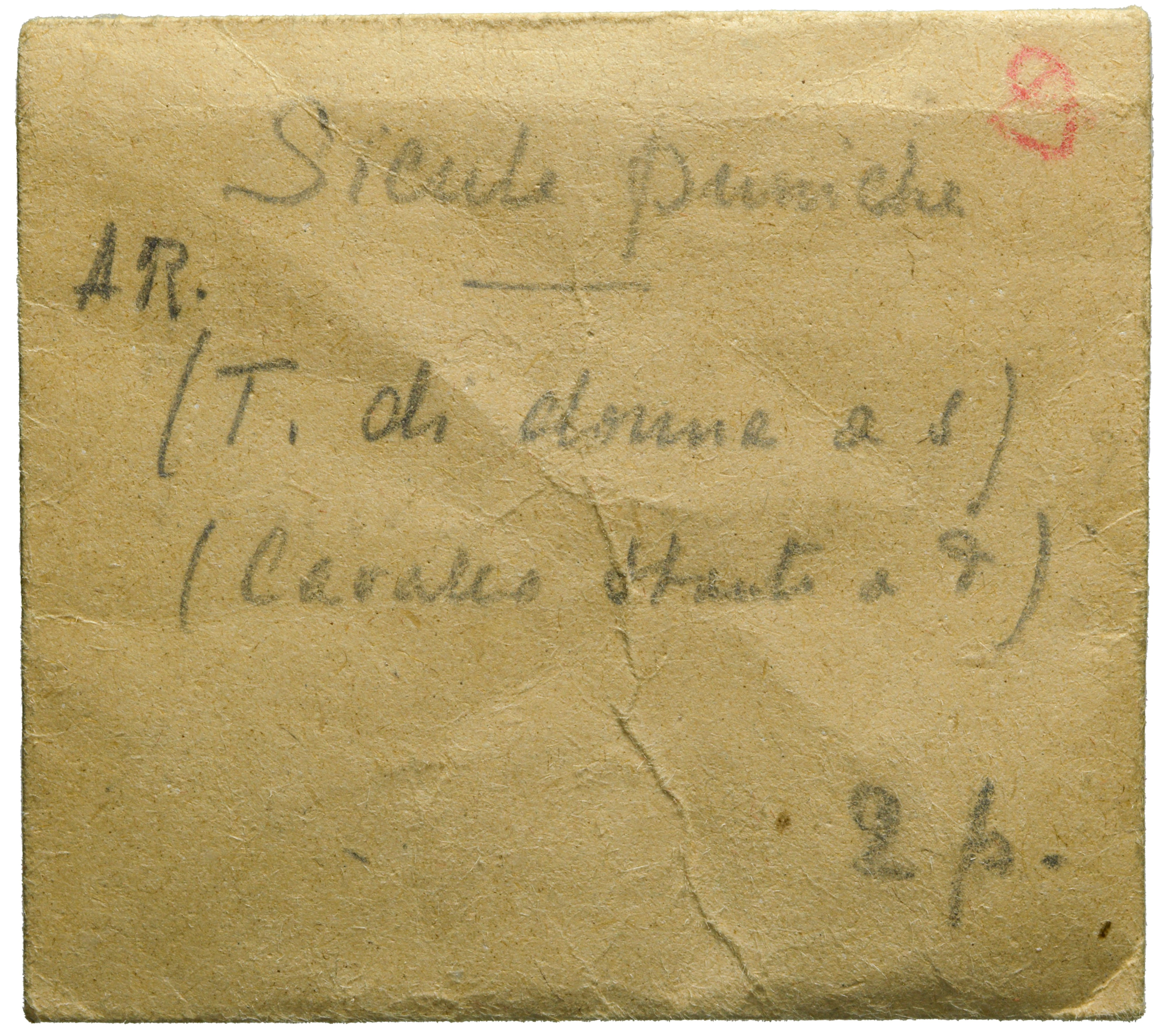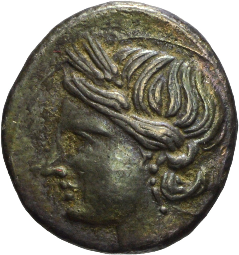 D/ Testa coronata di Tanit a sinistra, R/ Cavallo stante a destra, Zecca di Cartagine, Metallo: AR, gr. 1,89, Diam.: mm. 14,31. mBB