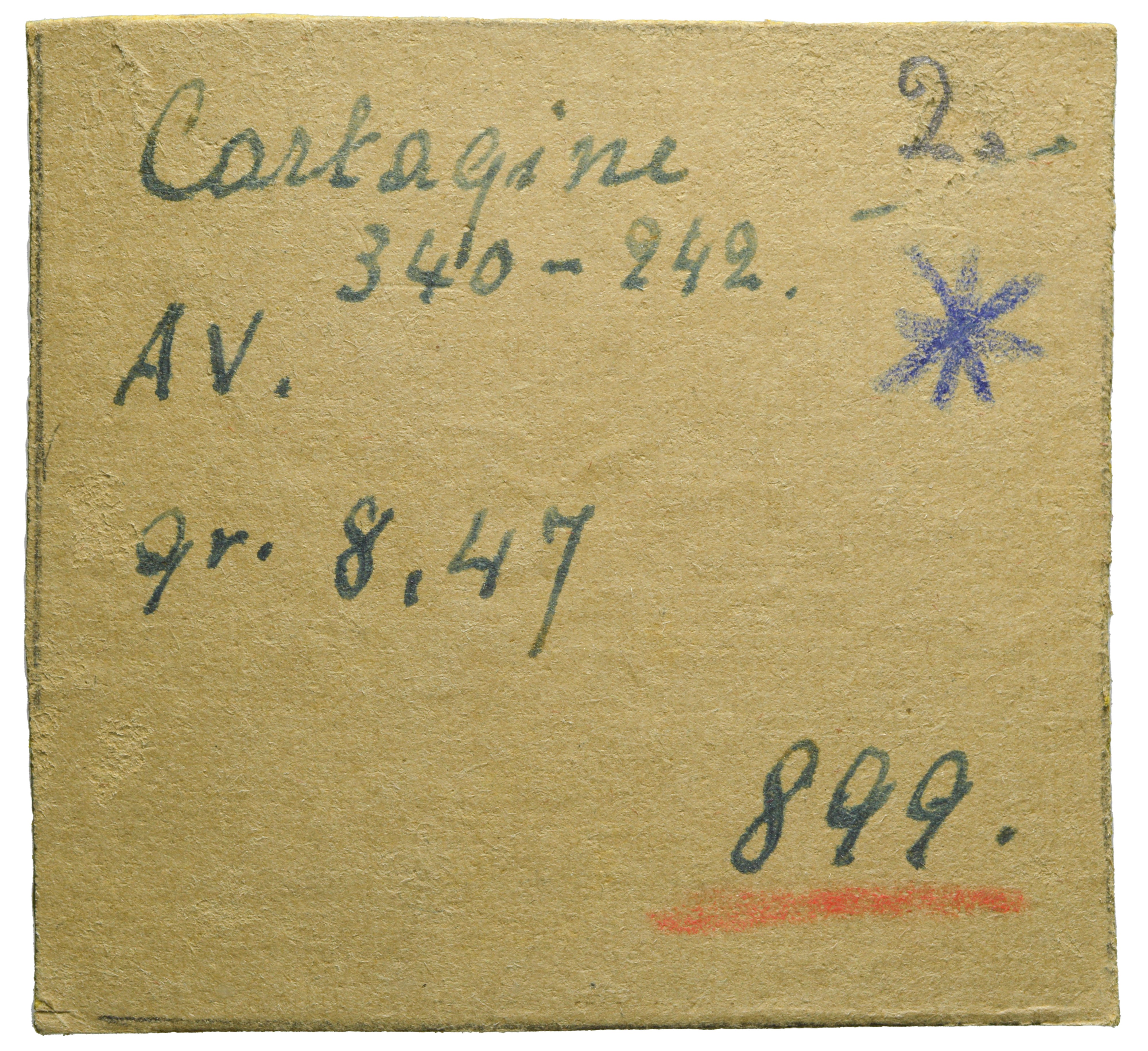 D/ Busto a sinistra di Tanit, R/ Cavallo stante a destra, con punto sotto lo zoccolo posteriore sinistro, Zecca di Cartagine, Coniazione siculo punica, Rif. Viola 2.3; Metallo: EL, gr. 7,41, Diam.: mm. 17,83. MB