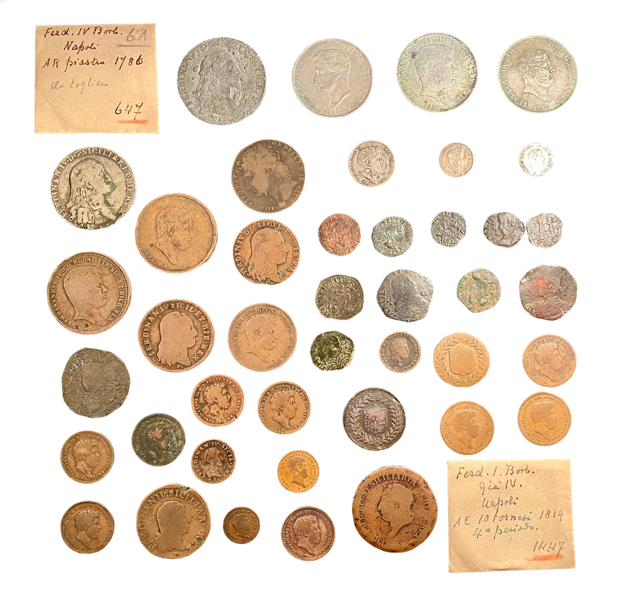 del Regno di Sicilia e del Regno di Napoli, sette in argento e trentatré in rame, e due falsi coevi della moneta da 120 grana 1786; 120 grana di Francesco II, 10 tornesi di Ferdinando I e Ferdinando II, e vari multipli di tornesi. da B a mBB