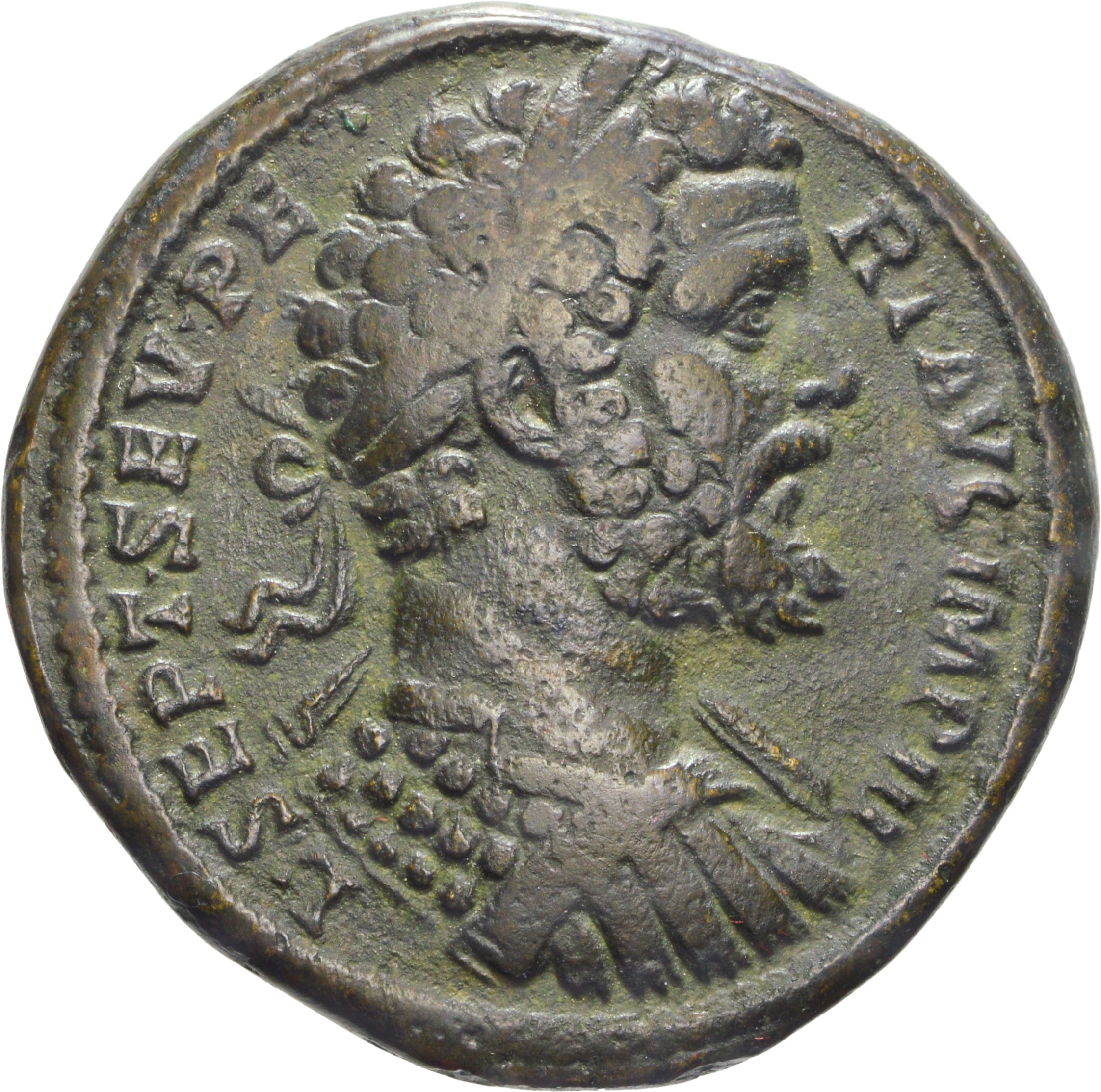 D/ L SEPT SEV PERT AVG IMP III, busto laureato con corazza a destra, R/ DIS AVSPICIB TR P II COS II P P, S C, Ercole con leontè e clava e Bacco con coppa e tirso stanti uno accanto all’altro, Zecca di Roma, Rif. bibl. R.I.C. 669/R2; Cohen 119; Metallo: AE, gr. 29,24, Diam.: mm. 32,65. BB