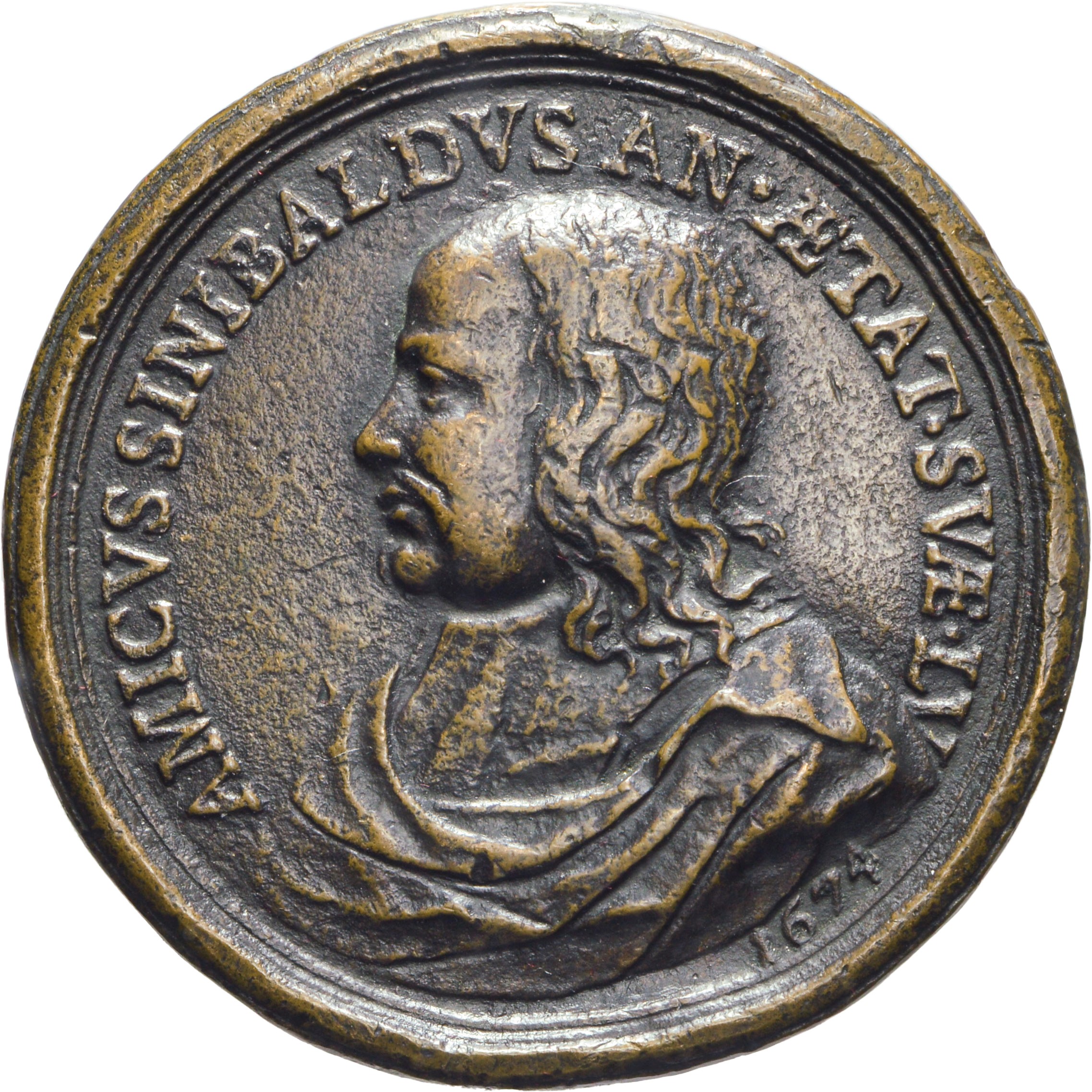 1674 D/ busto a sinistra, R/ Scudo ovale bordato, in alto e ai lati, da nastro svolazzante con iscrizione, Rif. bibl.: Johnson 260, Medaglia fusa, realizzata nel 1674, per ricordare Giovanni Francesco Sinibaldo (1508-1568), dottore in medicina. Gr. 46,49, Diam.: mm. 52,44. BB