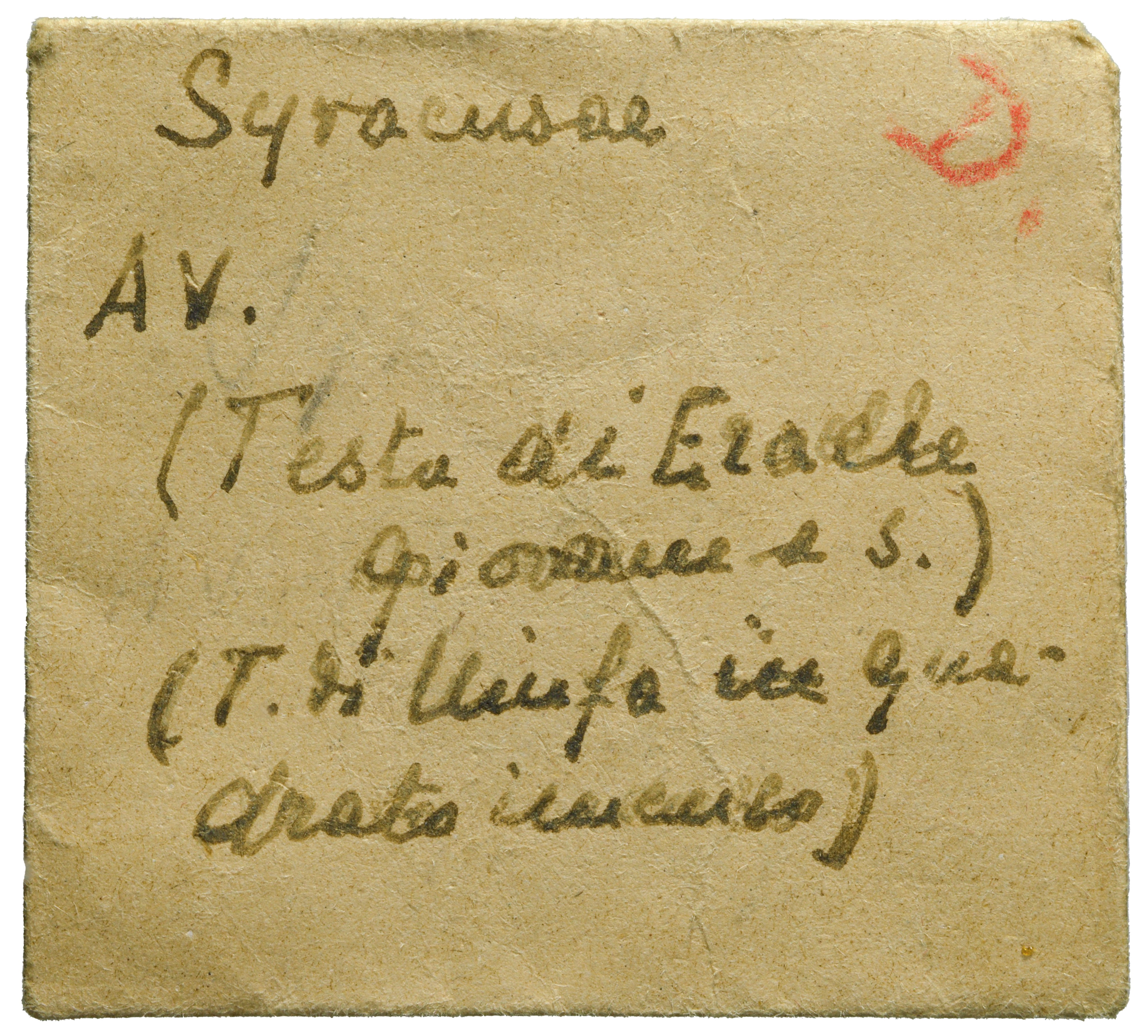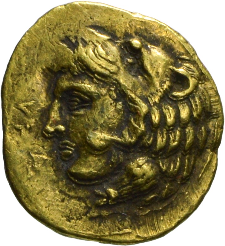 D/ Busto a sinistra di Ercole con leontè, R/ testa di Aretusa a sinistra in quadrato incuso, Zecca di Siracusa, Rif. Buceti 476/R3; Metallo: AV, gr. 1,15, Diam.: mm. 12. BB