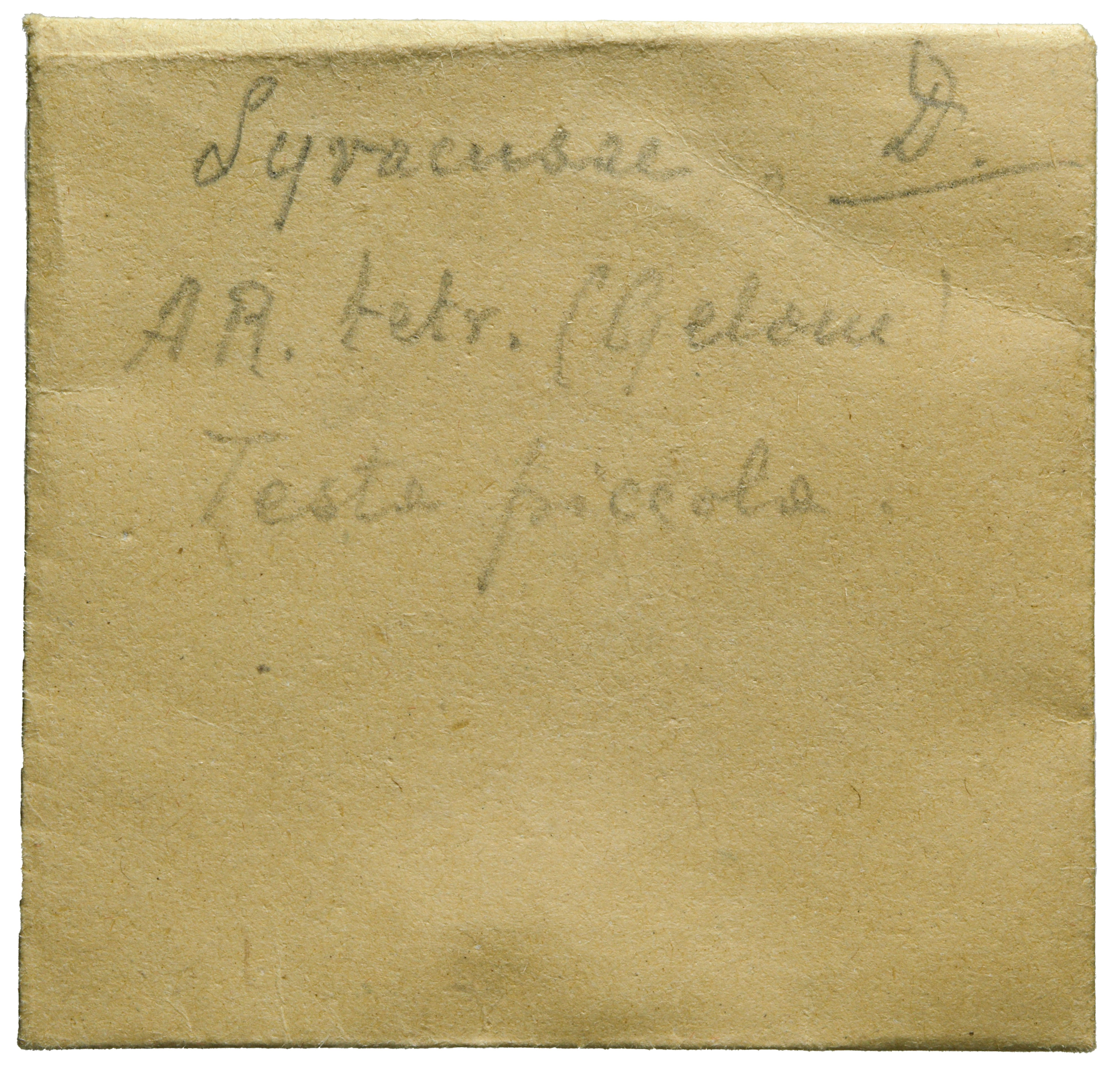 D/ auriga a destra, R/ testa di Aretusa a destra, Zecca di Siracusa, Rif. Buceti 190/R; Metallo: AR, gr. 16,70, Diam.: mm. 23,96. BB
