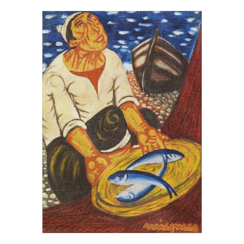 GIUSEPPE MIGNECO (Messina 1908 - 1997) Pescatore olio su tela di juta cm 39,2x29,2 firmato in basso a destra al retro sulla tela timbro catalogo generale con n. archiviazione 6248