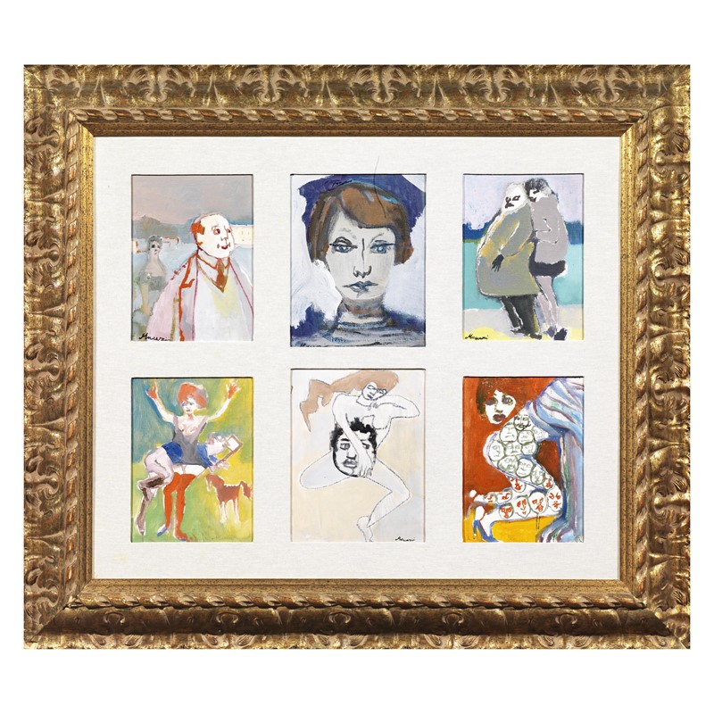 MINO MACCARI (Siena 1898 - Roma 1989) Personaggi sei tavole in unica cornice olio su cartone telato cm 24x18 cadauno; in totale cm 61x74 ciascun disegno firmato Maccari al margine inferiore L'opera è accompagnata da autentica su fotografia firmata dall'artista.