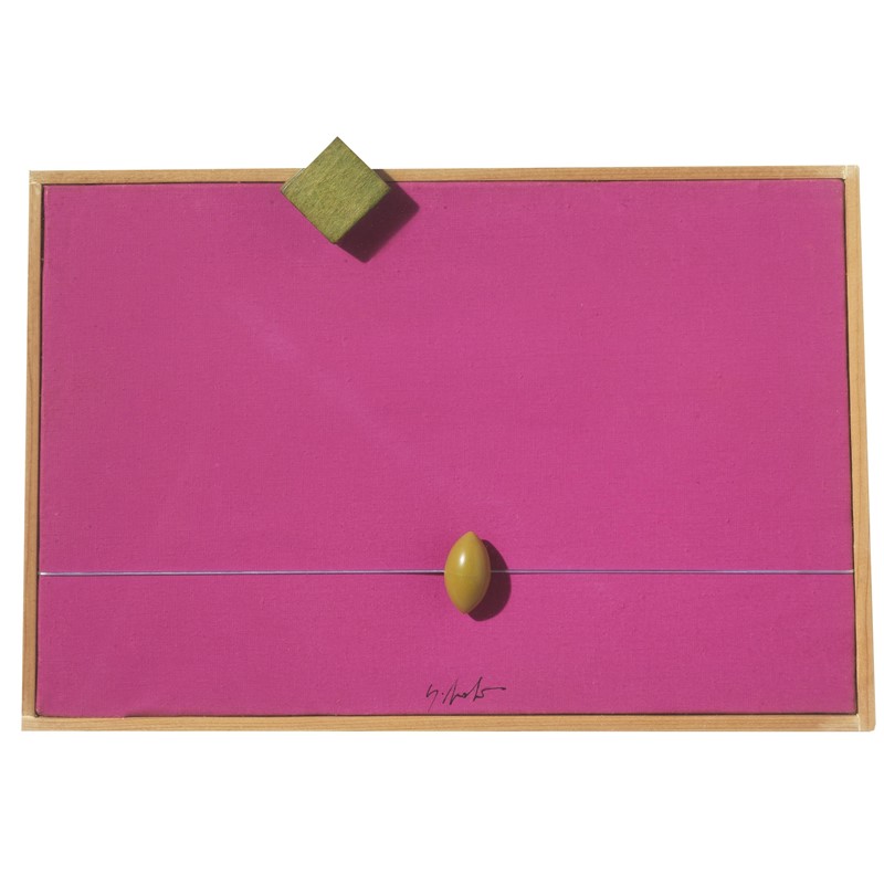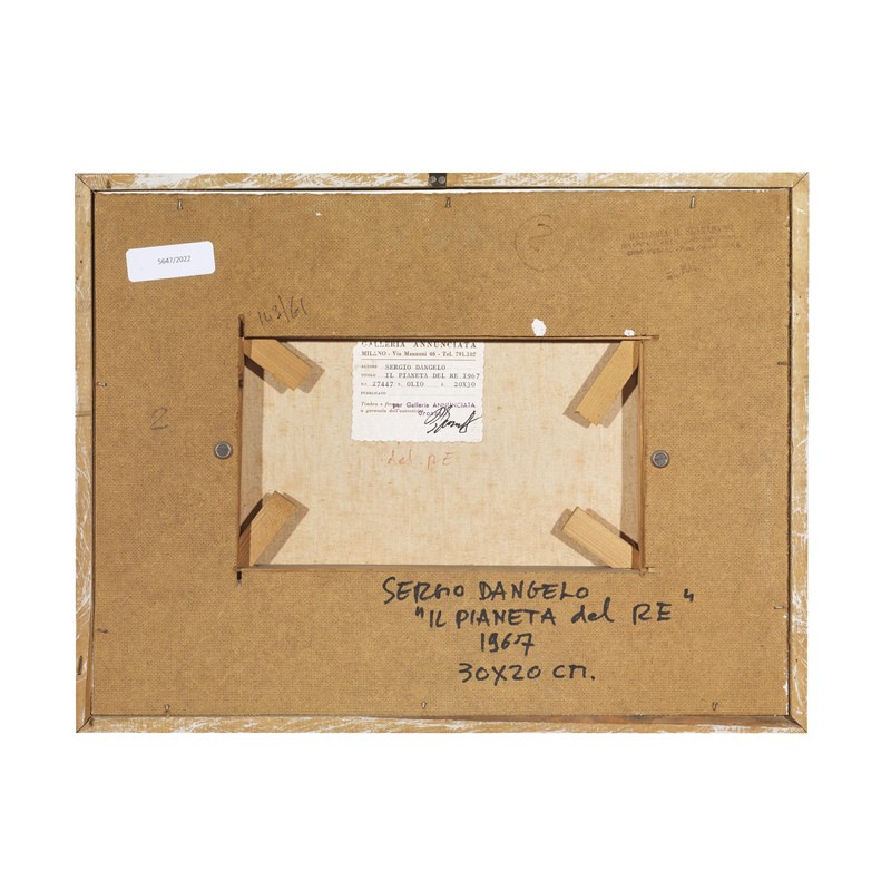 SERGIO DANGELO (Milano 1932) Il pianeta del re 1967 olio e tecnica mista su tela cm 20x30 firmato in basso al centro al retro sulla tela titolato al retro sulla tela cartiglio e timbro Galleria Annunciata Milano firmato dall'artista al retro sul telaio timbro altra galleria