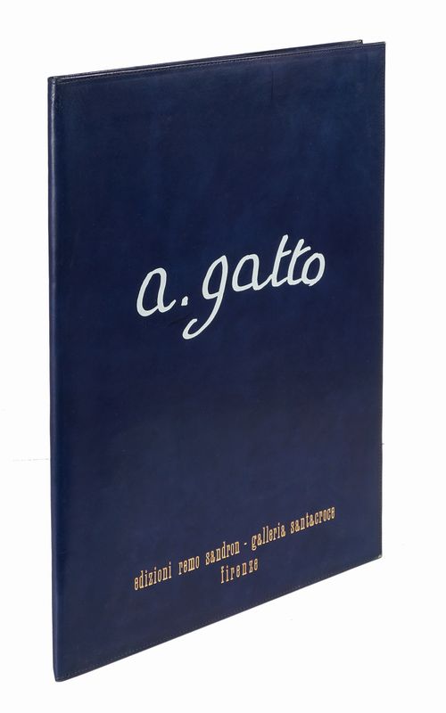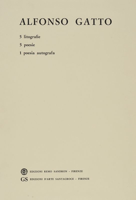 Cartella in folio (mm 510x355). Contenente una poesia manoscritta autografata da Alfonso Gatto, 5 carte di poesia e 5 litografie a colori, ciascuna firmata e numerata a matita in basso a destra "46/50". Veline protettive tra le carte. Cartella in piena pelle blu con sguardie in seta e titoli impressi al piatto anteriore. Perfette condizioni.