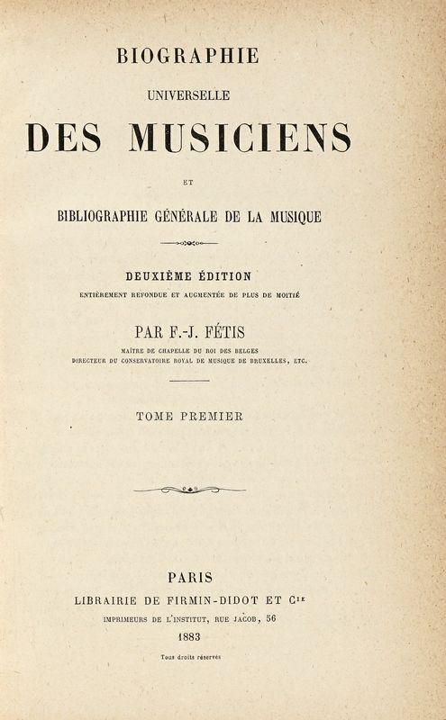 8 volumi in-8° (mm 235x150). Lievi e uniformi bruniture della carta, ma nel complesso ottimo stato di conservazione. SI AGGIUNGE: Biographie universelle des musiciens et bibliographie générale de la musique [...]. Supplément et complément [...] Tome premier (-second). Paris: Librairie de Firmin-Didot, 1881. 2 volumi in-8° (mm 235x150). Il tutto in legatura uniforme in mezza pelle con punte e piatti in carta marmorizzata; fregi e titoli in oro al dorso a 5 nervi, sguardie marmorizzate e tagli rossi. Minimi difetti, altrimenti ottima copia.