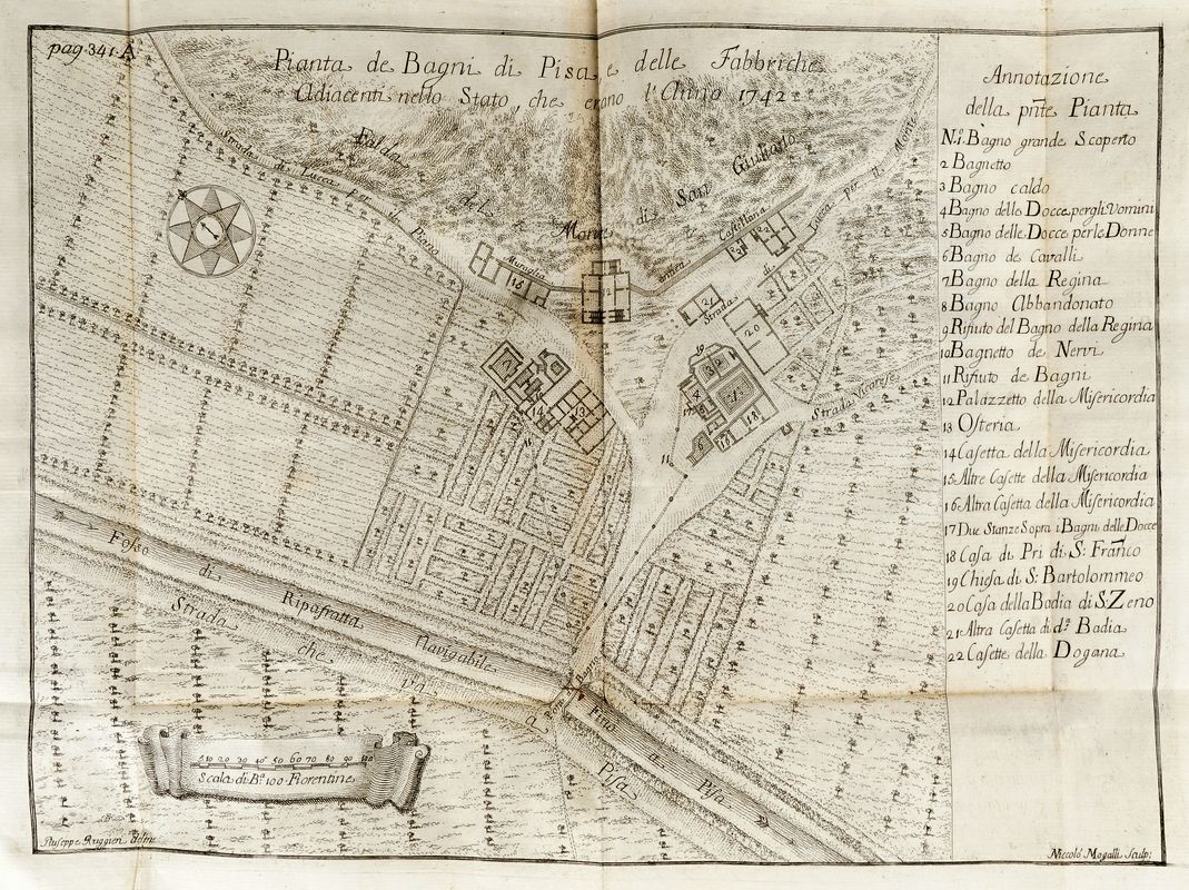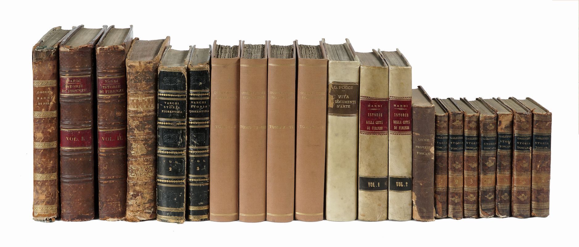 In-4° (mm 250x175). Pagine [12], 415 con 5 [di 7] tavole fuori testo ripiegate, delineate da M. Piazzini, G. Ruggeri, G. Zocchi e incise in rame da Nicolò Mogalli. Frontespizio in rosso e nero con sotto 2 medaglie incise in ovale e vignette nel testo. Minime macchie, opera scompleta di 2 tavole ma internamente ben conservata. Legatura ottocentesca in mezzo vitello biondo con piatti in carta decorata e titolo in oro su tassello al dorso. Mancanze a cuffie e unghiature, angoli stanchi. SI AGGIUNGE: Segni Bernardo, Storie fiorentine [...] dall'anno 1527. fino al 1555 [...] colla vita di Niccolò Capponi [...]. Tomo primo (-secondo). Augusta e Palermo: dalle stampe del Rapetti a pie di Grotta, 1778. 2 tomi in 1 volume in-4° (mm 240x174). Pagine XII, [8], 108, 320; [2], 208. Testatine in calcografia. Occasionali e lievi macchie ma ottimo stato conservativo. Vita di Niccolò Capponi legata all'inizio del volume ma presente. Legatura coeva in pieno vitello con titolo in oro su falso tassello al dorso. Mancanze al dorso e alle cuffie, angoli leggermente stanchi. SI AGGIUNGE: Varchi Benedetto, Storia fiorentina [...] con aggiunte e correzioni tratte dagli autografi e corredata di note per cura e opera di Lelio Arbib. Volume secondo (-terzo). Firenze: a spese della Società Ed. delle storie del Nardi e del Varchi, 1838-1841. 2 volumi [di 3] in-8° (mm 148x231). Pagine 597, [1]; 438, [3], 1 bianca. Opera scompleta del primo volume, con alcune fioriture e un foro in alto a destra nelle ultime pagine del terzo volume. Legatura coeva in mezza pelle con punte in pergamena e piatti in carta decorata. Titoli in oro su tassello al dorso. Mancanze lungo le cerniere. SI AGGIUNGE: Nardi Jacopo, Istorie della città di Firenze [...] Volume primo (-secondo). Firenze: a spese della società editrice delle storie del Nardi e del Varchi, 1842 (2 copie). SI AGGIUNGE: Giusti Giuseppe, Raccolta di proverbi toscani. Firenze: successori Le Monnier, 1871. SI AGGIUNGE: Poggi Giuseppe, Ricordi della vita e documenti d'arte. Firenze: Bemporad, 1909. SI AGGIUNGE: L'osservatore fiorentino sugli edifizi della sua patria [...] Tomo primo (-ottavo). Firenze: Gaspero Ricci, 1821. SI AGGIUNGE: Galluzzi Iacopo Riguccio, Istoria del Granducato di Toscana [...] Tomo I (-VII). Livorno: stamperia Vignozzi, 1820-21.