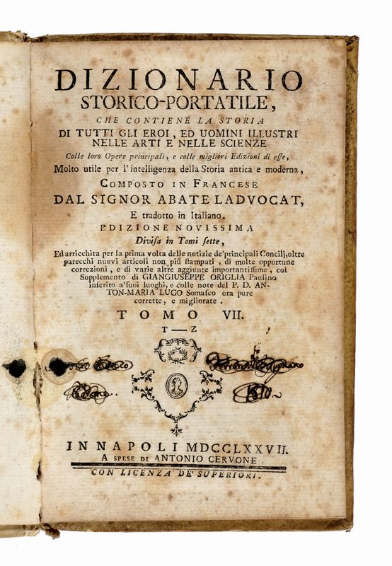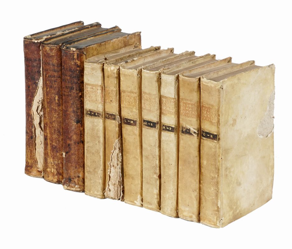 7 volumi in-8° (mm 176x120). Legatura coeva in piena pergamena rigida con titoli in oro su tassello al dorso. Una mancanza al piatto del volume VII. SI AGGIUNGE: Mamachi Tommaso Maria, De' costumi de' primitivi cristiani libri tre... Tomo I (-III). In Roma: presso gli eredi di Gio. Lorenzo Barbiellini stampatori, 1753-1754. 3 volumi in-8° (mm 200x128). Legatura in piena pergamena coeva con titolo manoscritto al dorso. Mancanze e macchie ai piatti, dorsi bruniti.