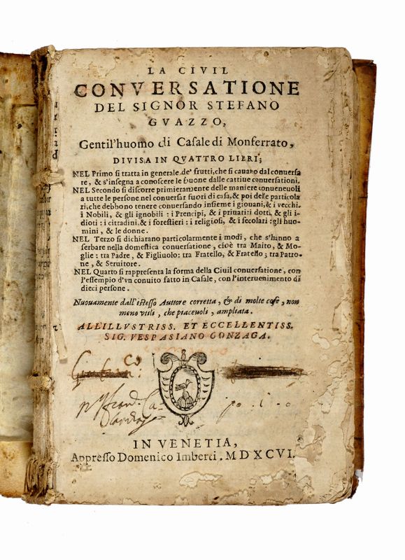 In-8° (mm 150x104). Carte [20], 316. Esemplare con macchie e mancanze marginali, lavori di tarlo che toccano talvolta il testo. Legatura coeva in piena pergamena floscia con titolo manoscritto al dorso. Legatura parzialmente staccata. Note di possesso al frontespizio. SI AGGIUNGONO: Justinianus, Digestum vetus seu Pandectarum iuris civilis tomus primus [...] Infortiatum seu Pandectarum iuris civilis tomus secundus. Venetijs: apud Iuntas, 1598. 2 volumi in-4° (mm 262x185). Legatura in pina pergamena rigida con titoli manoscritti al dorso. Numerose mancanze a cuffie, cerniere e dorso, macchie ai piatti. Panigarola Francesco, Prediche quadragesimali... In Venetia: appresso Gio. Battista Ciotti Senese, al segno dell'Aurora, 1598.