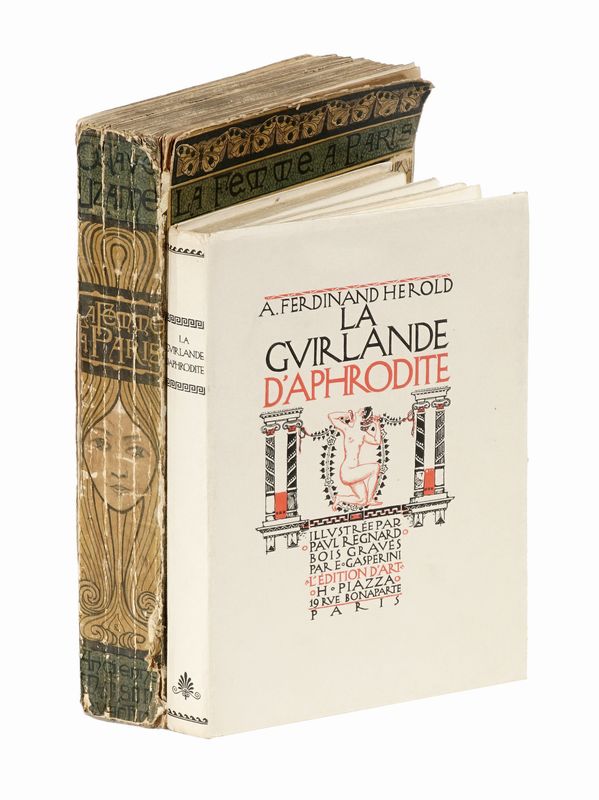 In-4° (mm 284x190). Pagine [4], VI, 328, [6] con 20 illustrazioni fuori testo a colori protette da velina. Numerose illustrazioni a colori nel testo. Esemplare in barbe, diffusamente fiorito. Brossura editoriale illustrata con titolo al dorso e al piatto anteriore. Mancanze e difetti, concentrati principalmente alle cerniere e al dorso. SI AGGIUNGE: Herold André-Ferdinand, La Guirlande d'Aphrodite. Illustrée par Paul Regnard... Paris: H. Piazza, 1919.