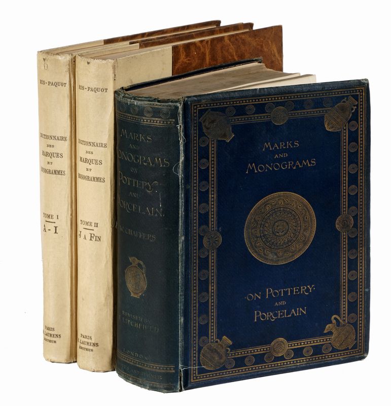 Compongono il lotto: 1) Chaffers William, Marks and monograms on European and Oriental Pottery and Porcelain... London: Reeves and Turner, 1903; 2) Ris-Paquot Oscar Edmond, Dictionnaire encyclopèdique des marques & monogrammes [...] Tome premier (-deuxième). Paris: Henri Laurens editeur, s.d.