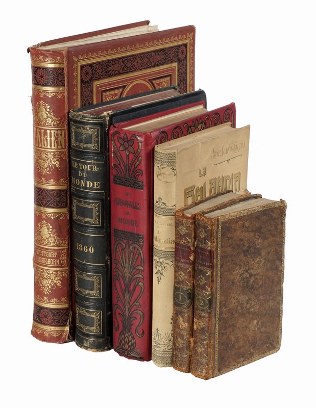 Compongono il lotto: 1) Brydone Patrick, Voyage en Sicile et a Malthe [...] Tome premier (-second). A Amsterdam: chez Pissot, 1775; 2) Cocchi Igino, La Finlandia. Firenze: successori Le Monnier, 1902; 3) Le tour du monde. Nouveau journal des voyages... Paris: Libraire de Hachette, 1861; 4) Les capitales du monde. Paris: Librairie Hachette, 1910; 5) Stieler Karl - Paulus Eduard - Kaden Woldemar, Italien Eine Wanderung von den Alpen bis zum Aetna... Stuttgart: Engelhorn, 1880.