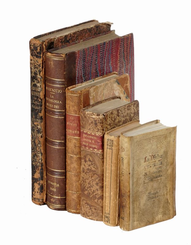 Compongono il lotto: 1) Alighieri Dante, La divina Commedia, con postille e cenni introduttivi del Prof. Raffaello Fornaciari... Milano: Hoepli, 1945; 2) Id., La Divina Commedia... Milano: Hoepli, s.d.; 3) Le notti romane al sepolcro degli Scipioni... Milano: s.e., s.d. (i.e. 1820 ca.); 4) Muratori Lodovico Antonio, Delle riflessioni sopra il buon gusto nelle scienze e nelle arti [...] Parte prima (-seconda). In Venezia: presso Niccolò Pezzana, 1736; 5) Boccaccio Giovanni, La genealogia degli dèi de Gentili... In Venetia: appresso Giacomo Sansovino, 1569; 6) Dall'Ongaro Francesco, Poesie. Volumi I (-II). Trieste: nella tipografia Marenigh, 1840.